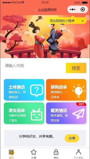 恋爱小助手微信QQ双端小程序源码,无需服务器和域名,可添加流量主,搭建教程都打包在文件里面了。