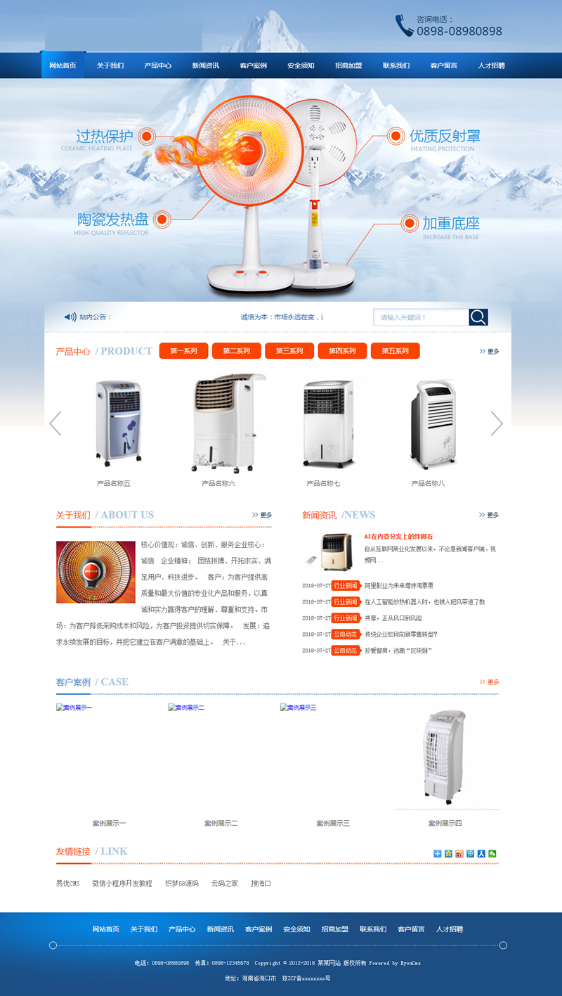 PHP源码_EyouCMSE响应式电暖扇空调扇小家电网站模板 EyouCMS 用起来比dedecms 要方便很多后台设置一目了然 没有太多繁琐的设置 演示环境:Linux+阿帕奇+php7.0+MySQL5.6 直接绑定域名 打开 按照提示安装就行了 非常的方便