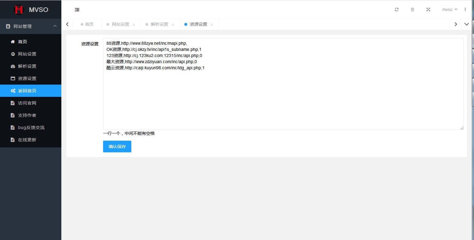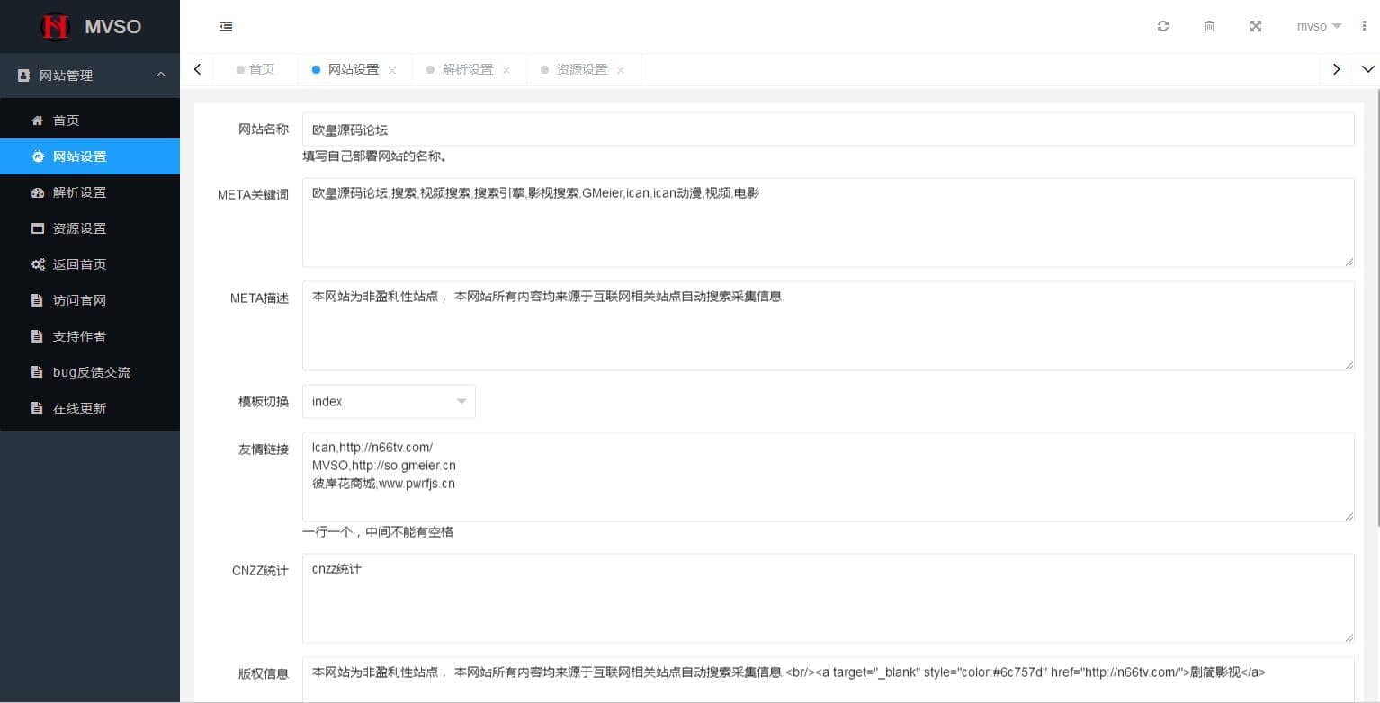 请用php7.1|7.2(推荐PHP7.2) 宝塔伪静态用thinkphp,EP面板上传直接用 不支持二级目录搭建本程序 !!!切记不需要设置二级目录!!! nginx伪静态在根目录.nginx.htaccess apache在根目录.htaccess ep面板无需设置伪静态 后台地址:域名/admin/index 用户名:mvso 密码:123456