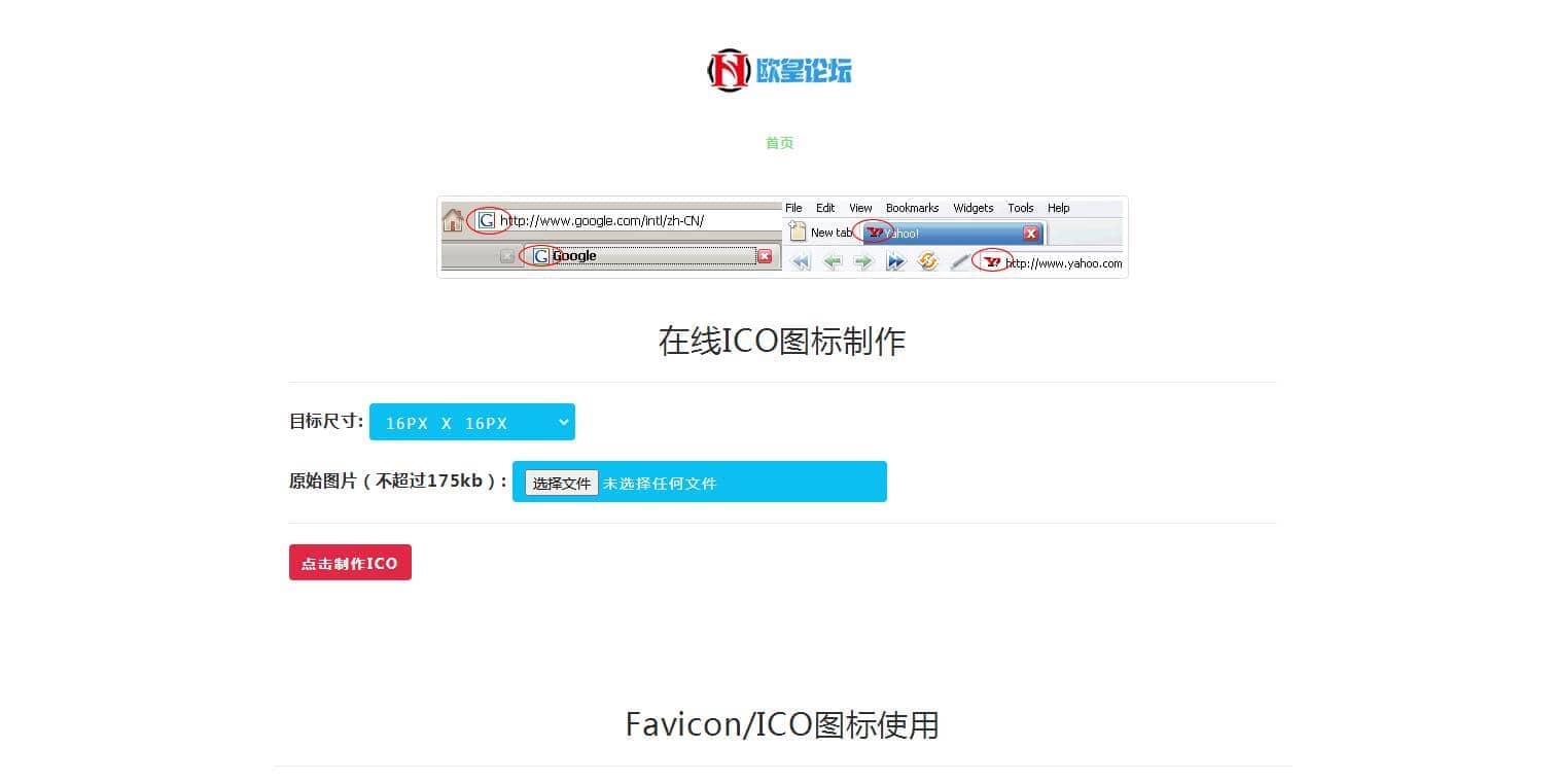 favicon.ico一般用于作为缩略的网站标志,它显示位于浏览器的地址栏或者在标签上,用于显示网站的logo,如图红圈的位置, 目前主要的浏览器都支持favicon.ico图标. 如果要让网站看起来更专业、更美、更有个性,制造一个favicon.ico是必不可少的! Favicon.ico图片在线制作网站PHP源码