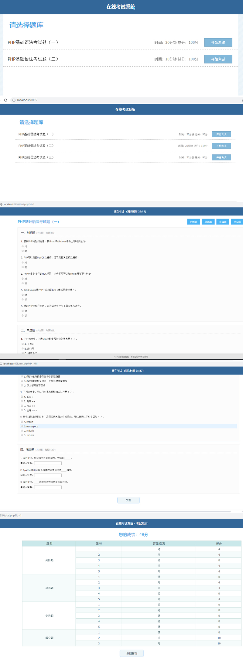 简单的PHP在线考试系统实例源码 无需数据库 无后台管理 声明:本站所有文章,如无特殊说明或标注,均为本站原创发布。任何个人或组织,在未征得本站同意时,禁止复制、盗用、采集、发布本站内容到任何网站、书籍等各类媒体平台。如若本站内容侵犯了原著者的合法权益,可联系我们进行处理。