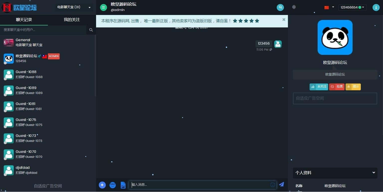 新增房间删除,用户删除,铭感聊天词汇屏蔽 新增生日,国家,性别个性图标 新增主题优化雪花特效 新增语音在线发送,语音聊天 新增2,000多种表情符号 新增首页聊天室搜索 新增聊天室用户搜索 新增聊天室最近文件展示
