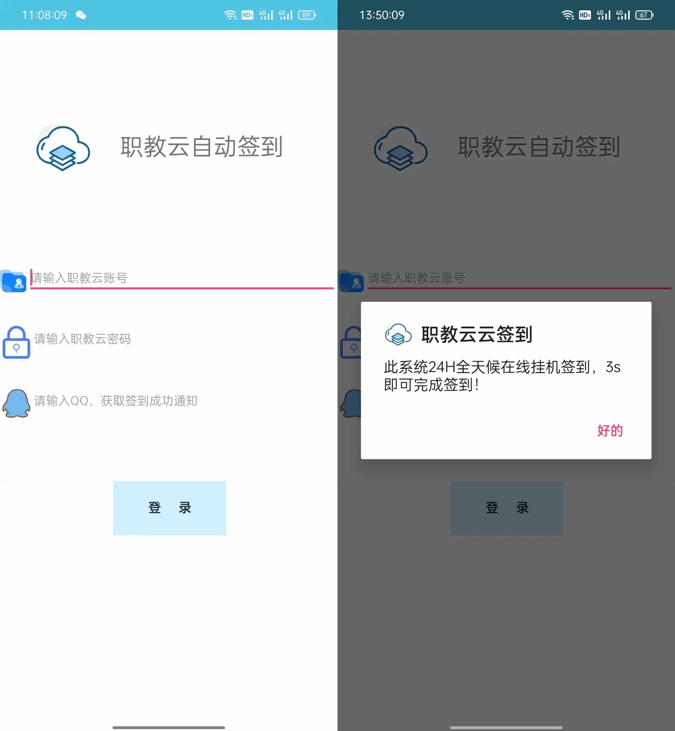 不知道这玩意是干啥的。搬运来的。没测试。以下是别的站的介绍: 大学生福音软件 职教云自动签到助手 3s监控,无视手势签到,全天候24H帮助你挂机签到!