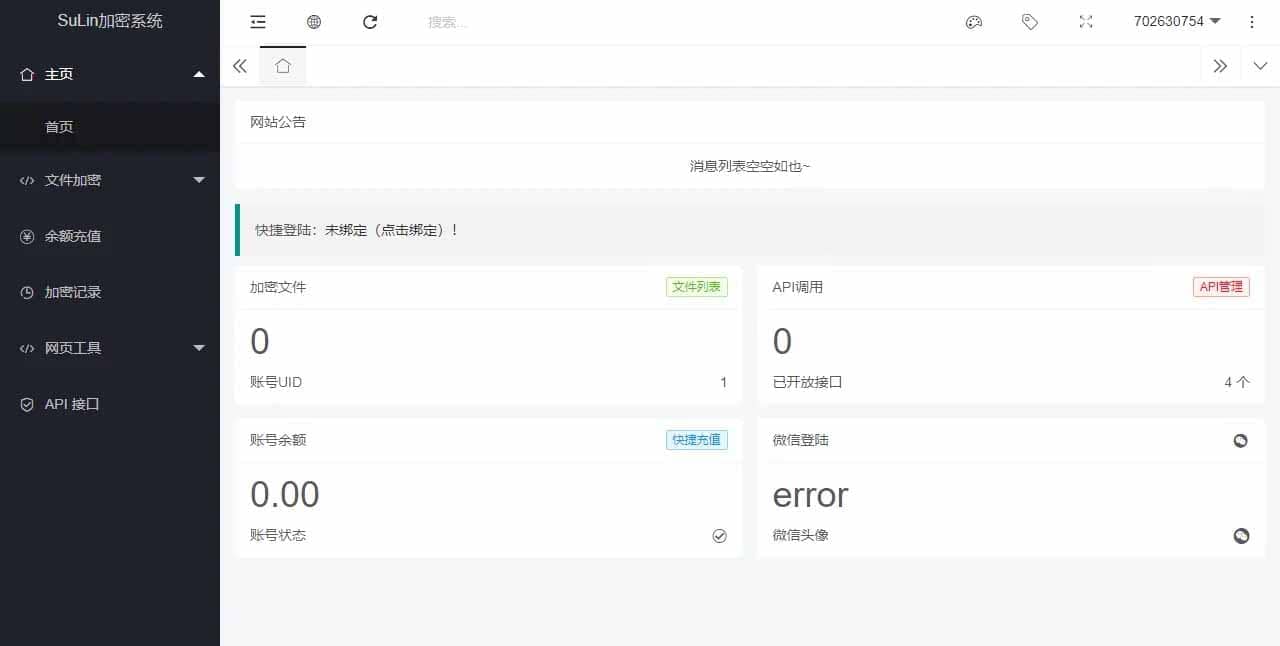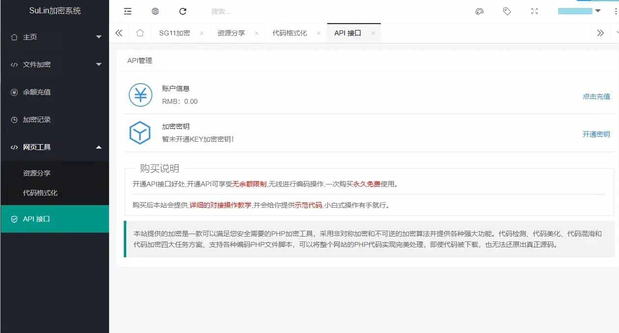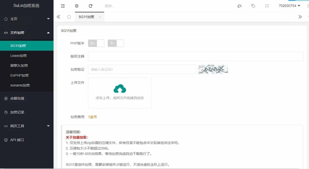 苏林加密系统是一款专门为php加密的程序,支持sg11加密、xend加密、goto加密、Leave加密、enphp加密、NoName加密 可以发展用户,可以设置某加密价格,支持API接口加密,对接官方支付、码支付和易支付。