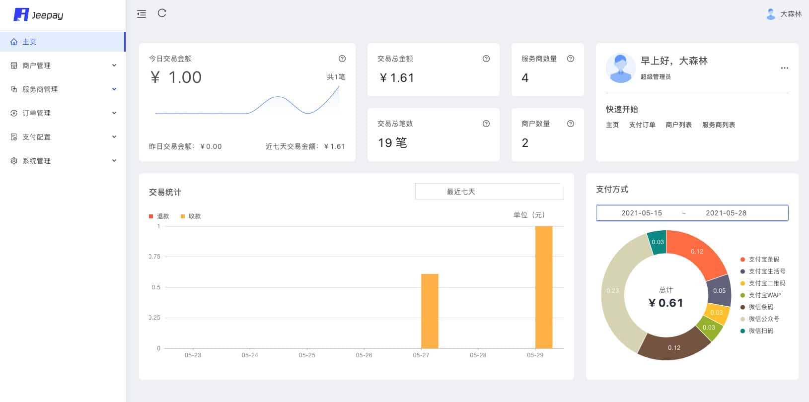 支持多渠道对接,支付网关自动路由; 已对接微信服务商和普通商户接口,支持V2和V3接口; 已对接支付宝服务商和普通商户接口,支持RSA和RSA2签名; 已对接云闪付服务商接口,可选择多家支付机构; 提供http形式接口,提供各语言的sdk实现,方便对接; 接口请求和响应数据采用签名机制,保证交易安全可靠; 系统安全,支持分布式部署,高并发; 管理端包括运营平台和商户系统; 管理平台操作界面简洁、易用; 支付平台到商户系统的订单通知使用MQ实现,保证了高可用,消息可达; 支付渠道的接口参数配置界面自动化生成; 使用Spring Security实现权限管理; 前后端分离架构,方便二次开发; 由原XxPay团队开发,有着多年支付系统开发经验。 搭建安装方式具体看文件包,带开发文档。