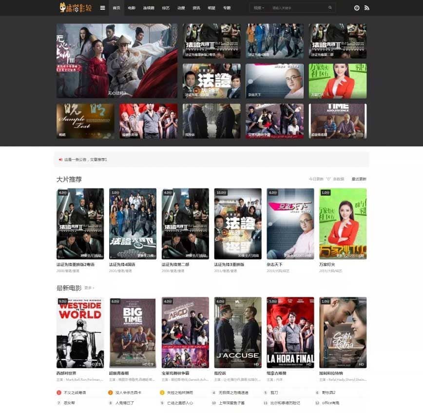 1、LOGO 更换在苹果 cms 后台上传就行了,二维码图片在 imags 路径替换。 2、首页轮播推荐 5,数量最多 10 个。 3、首页轮播右边推荐 4,数量最多 11 个。 3、大片推荐是推荐 1,数量最多 6 个。 4、荧屏巨星明星推荐 1,数量最多 8 个。 5、新增影片下载模块。 6、新增播放页增加切换线路提示语,播放器增加滚动提示语。 7、首页新增公告,文章推荐 1 就是公告内容。 8、其他更多功能,请自行体验。