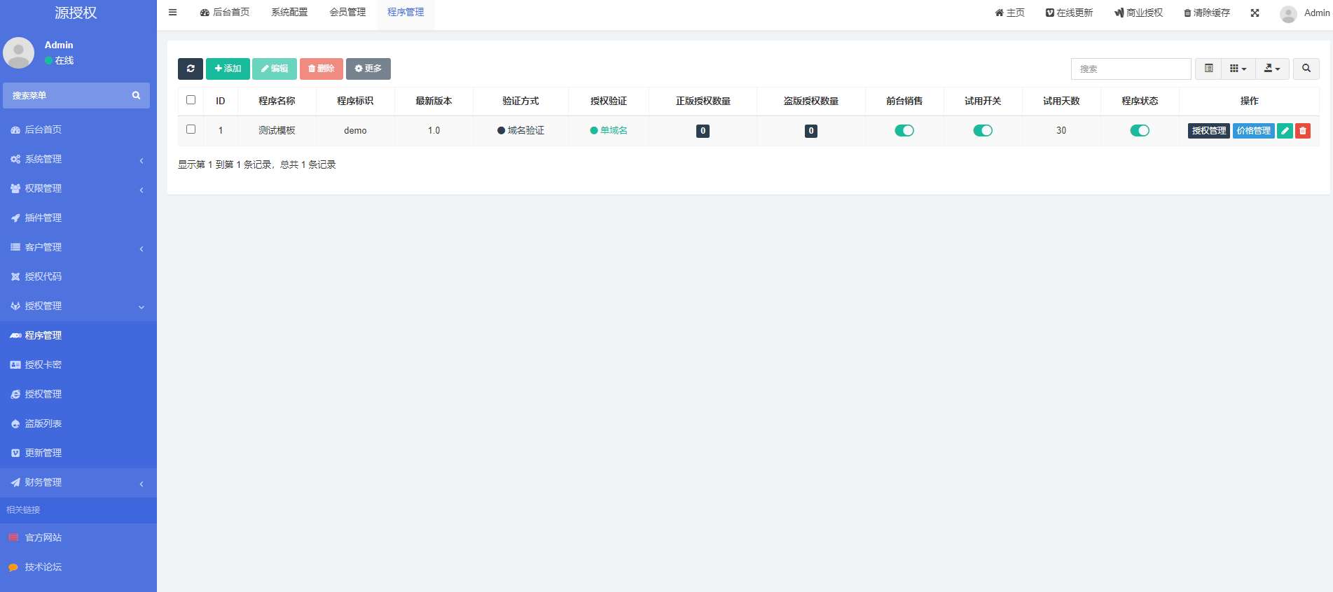 源授权是一款全新架构的授权系统.采用thinkphp 5.0开发,内置各种强大的功能,邮件管理,腾讯云短信、阿里云短信等.后台强大简洁,使用方便快捷,支付模块集成易支付功能,前台支持自助购买和操作管理授权! 服务器环境要求的配置:PHP 7.2+ 和 Mysql 5.6(推荐使用linux版本宝塔进行管理搭建,完美) 基本功能 支付接口集成了易支付 前台可使用卡密授权激活 支持多程序在线自助授权 短信集成腾讯/阿里云短信 支持前台在线充值支付购买 快捷登录方式集成了QQ/微信/微博 可自行对管理权限进行补差价升级 安全 稳定 简约 新UI · 告别繁琐操作 多端授权 · 一站多控 · 授权统一管理方便快捷 更新日志 V1.6 – 2021.10.04 优化程序管理,显示程序名称,数据统计 修复创建程序后创建时间不显示问题 更新卡密状态,类型,使用天数,名称的显示 更新API返回信息同步后台授权返回设置项 修复授权验证不存在问题 修复后台首页报错问题 修复无法新增程序 V1.5 – 2021.10.02 程序标识改为随机生成,8位不重复数字+字母组合 授权方式改为多选方式,更加灵活方便 增加授权码授权方式,域名、IP、授权码三种方式任意组合 增加程序管理中试用授权数量显示 API地址更改,API检测代码重构 站点授权管理查询新增Tab页,正式授权以及试用授权 站点授权中逻辑修改,改为继承程序管理中设定作为判定条件 授权管理新增授权授权码自动生成,可在修改中点击重置进行更改 修复授权状态判断无效问题 盗版管理新增盗版类型,UI优化,查看更加方便快捷