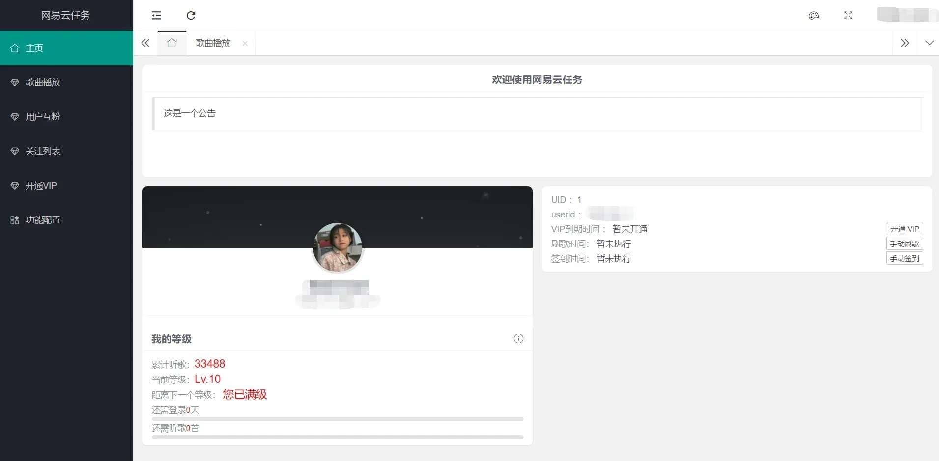 支持充值 会员使用 每日签到打卡任务 刷歌曲播放 刷粉丝等