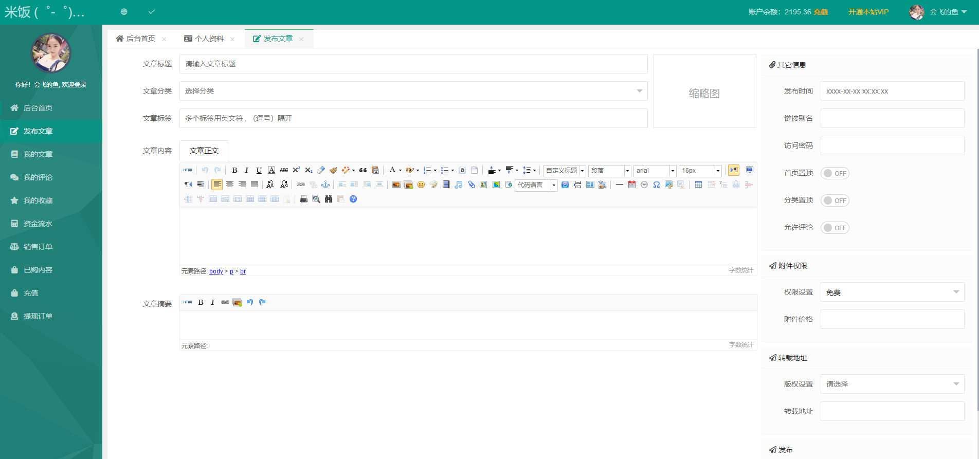这UserEmlog去年作者已经在开始弄了,但是种种原因被迫停止了项目,期初还有人叫作者开源个免费版的, 之前是不打算开源的,但是现在由于现在emlog这,我还是开源了吧。目前只实现了一些基础功能, 详情看下方介绍简介这是一款专为emlog写的一个独立会员中心(UserEmlog),其实是闲着蛋疼而弄的! UserEmlog基于emlog6.0.1老司机修改版开发的,暂时不知道支持不支持其他版本。 功能介绍 登入注册:前台支持登入注册功能 找回密码:忘记密码可找回密码,前台页面 会员中心:登入成功后进入的会员中心主页 资料修改:可以自主修改资料头像等 发布文章:强大的发布文章功能,但是部分功能需要模板的支持 文章管理:可管理自己已发布的文章 我的评论:查看自己所有的评论 文章收藏:收藏文章功能,此功能需要自己在模板增加此功能 资金流水:更详细的充值流水功能,获得资金流水 销售订单:已购买文章的订单 已购内容:已购买内容的订单 提现订单:提现的订单 作者有话说 目前本人第一个版本也是最后面一个 版本,可能存在不少bug有能力的自己修复。 起初以为emlog不会更新了就打算用6.0.1开发一个,没想到进程搞到一半事emlog pro出来了, 然后就这样弃坑了。主要是还有其他原因,工作忙出差了大半年搁置了这个项目,外地又没电脑天天下班晚上班早中午没时间休息。 现在源码我也放出来了,希望各位能够替我坚持下去,且希望各位能够保留我的一个小版权, 不管各位是收费也好免费也罢都希望各位保留个版权给我。 原创作者:会飞的鱼(米饭)安装方法下方下载得到一个压缩包后,进入emlog的根目录,就是网站根目录把压缩包解压出来即可 安装方法 下方下载得到一个压缩包后,进入emlog的根目录,就是网站根目录把压缩包解压出来即可 前台引入链接即可 登入入口:/user/login.php 注册入口:/user/register.php 找回密码:/user/forgetpassword.php 目录说明 css:是存放css文件 js:存放js文件 font:存放图标 html:存放会员中心各个页面。以及功能文件详情自己看下即可 images:存放图片 include:头部文件底部文件 ajax.php:全局功能 forgetpassword.php:找回密码 index.php:入口文件 login.php:会员登入 register.php:会员注册