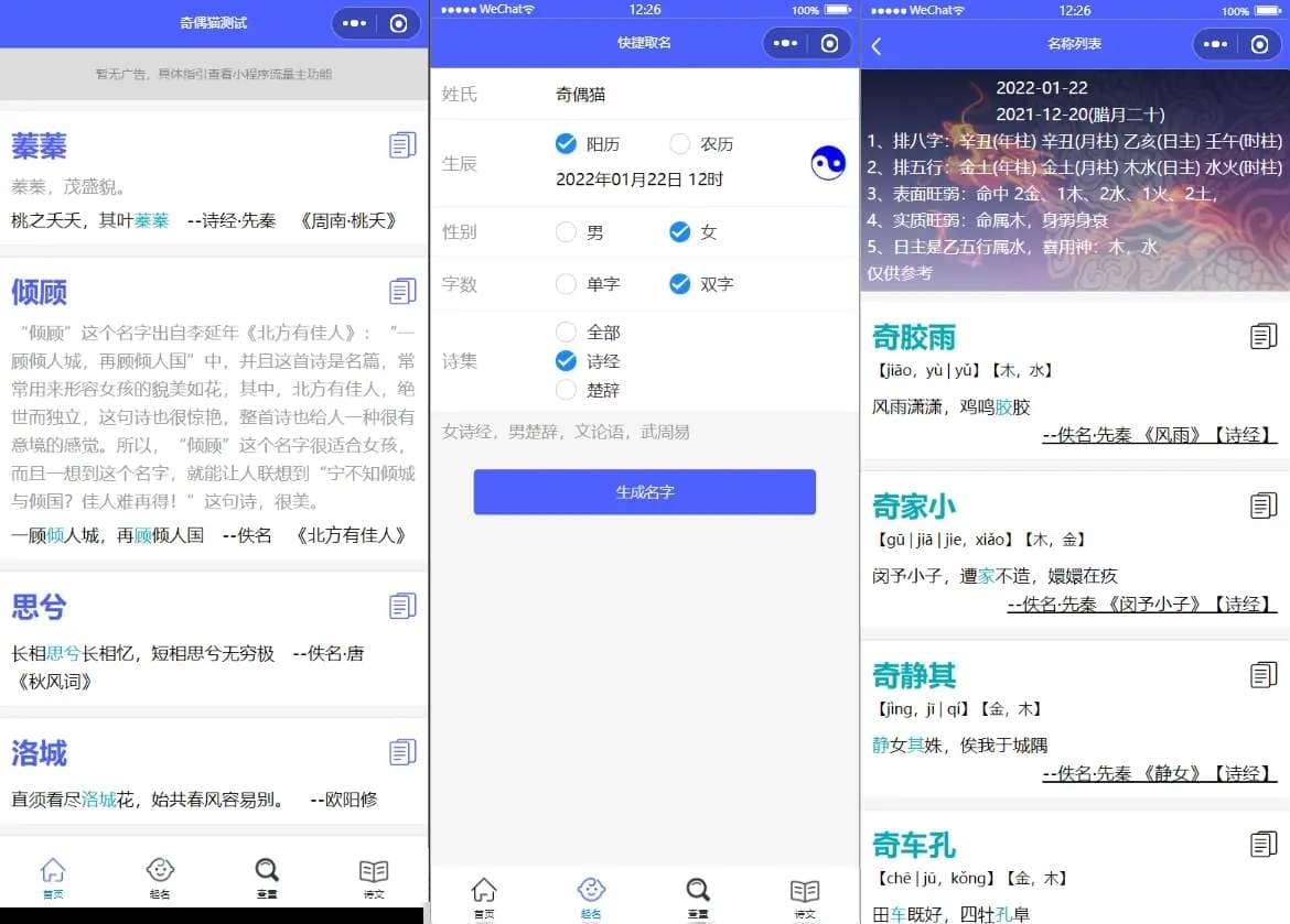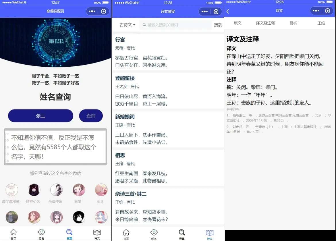 这是一个实用需求量还是比较高的一款微信小程序源码 由多个功能组合而成,具体如下 名字来源查询 取名工具(支持多种选择取名) 查询重复名(输入名字查询有多少人和你吃饭) 诗文(里面就是一些古诗啥的展示) 另外小编也给加了一些流量主进去,以方便大家运营!