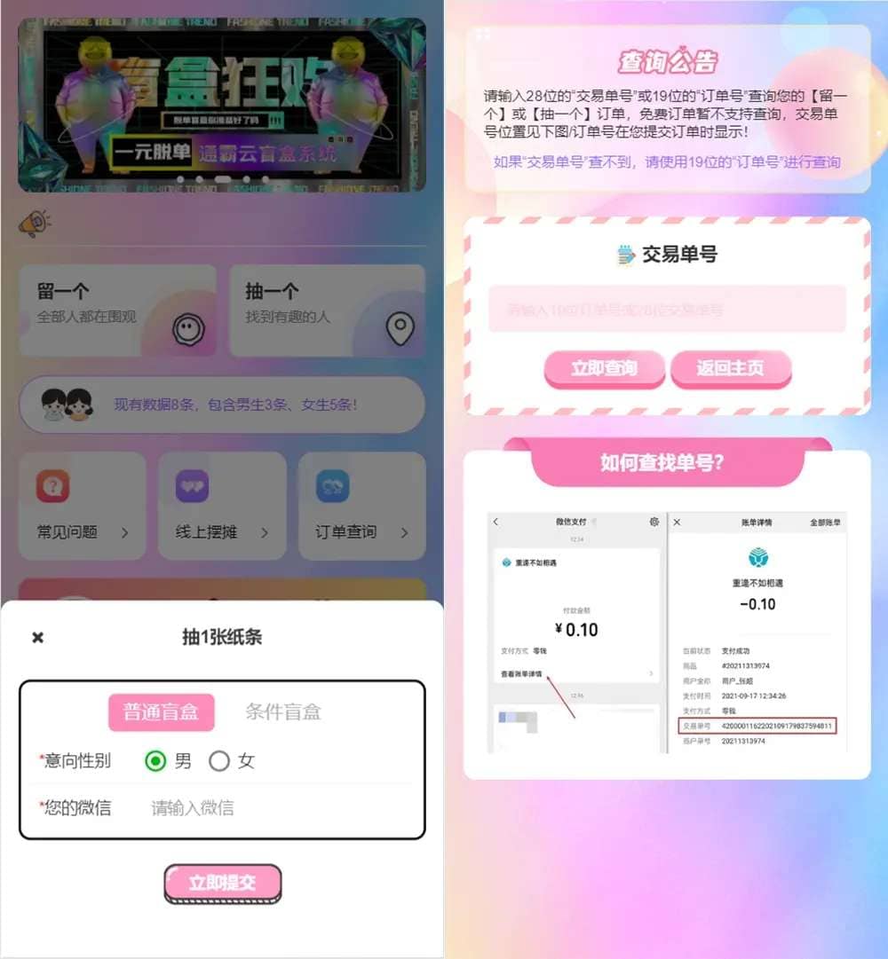 源码介绍: 最新H5交友盲盒系统V2.0.1版本_站长亲测 测试环境:Nginx+PHP7.2+Mysql5.6 源码截图: 声明:本站所有文章,如无特殊说明或标注,均为本站原创发布。任何个人或组织,在未征得本站同意时,禁止复制、盗用、采集、发布本站内容到任何网站、书籍等各类媒体平台。如若本站内容侵犯了原著者的合法权益,可联系我们进行处理。