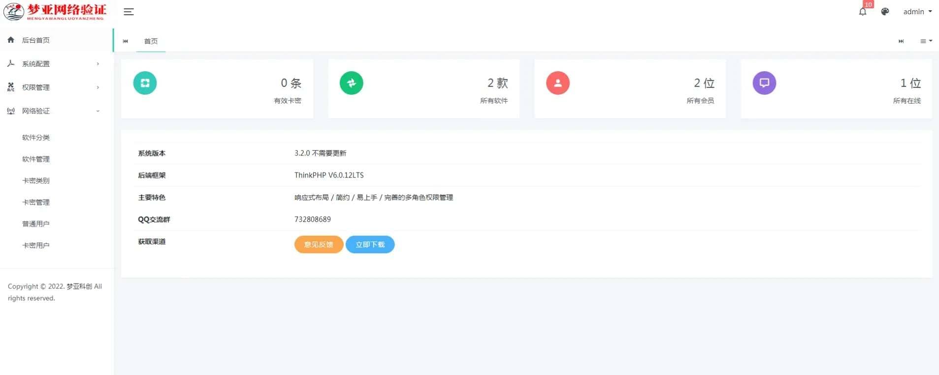 梦亚网络验证,基于thinkphp6.0+Bootstrap开发而成!后台管理系统是梦亚开发而成! 网络验证功能也是梦亚开发而成!全量开源!