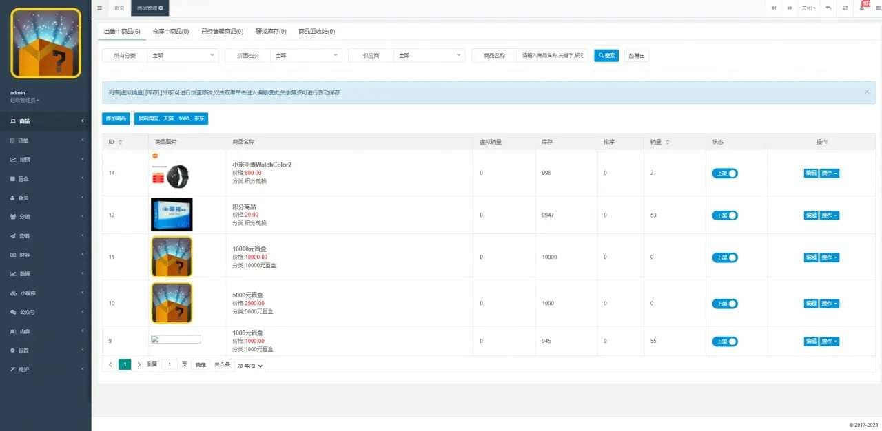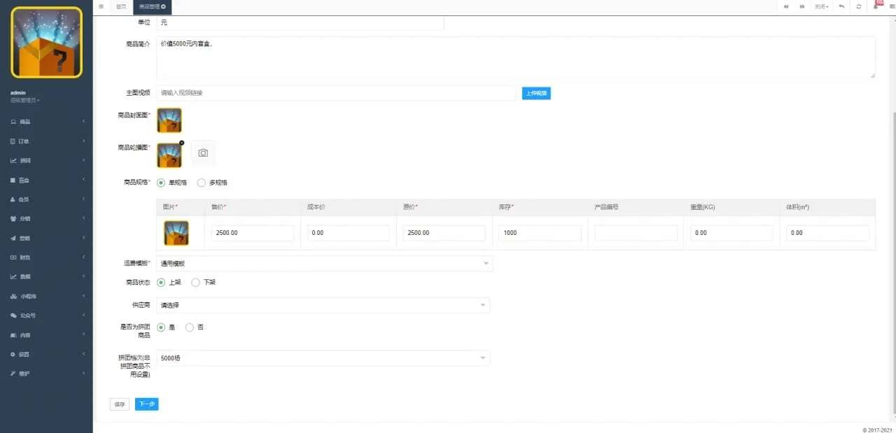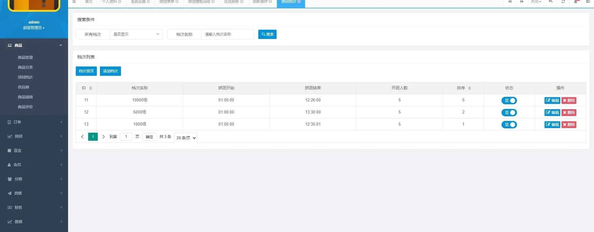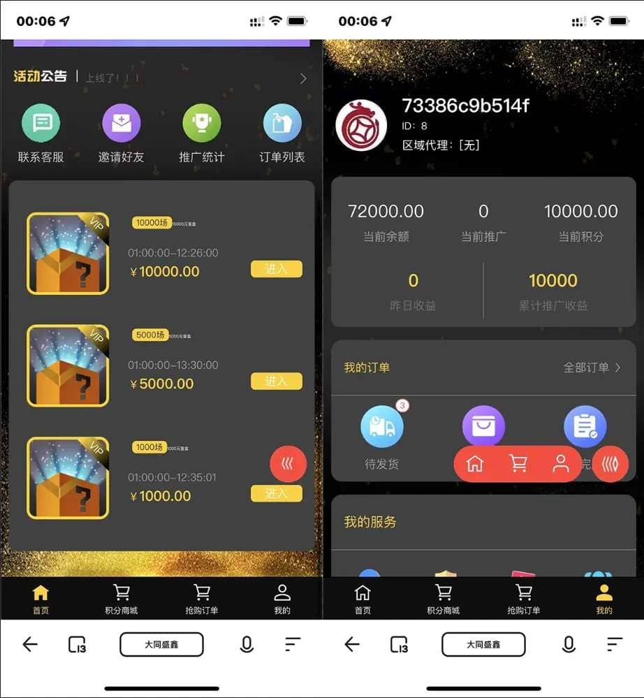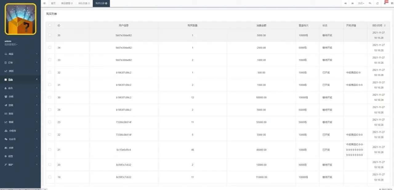 H5拼团抽奖盲盒源码,抽奖拼团玩法,三个房间,每个房间的价格不一样,比如1000的房间, 里面的商品价格是1000以内的,用户购买之后等待开奖,然后平台随机发货,盲盒模式 liunx宝塔搭建,推荐Apache,PHP7.3,MySQL5.6 需要准备服务号和微信支付商户。 前言 新的营销和带货模式,玩法多样,可与很多项目场景结合。 切勿变相用于bo彩,否则后果自负! 首发价格肯定是低的了,低价刷波量,可能下一秒就涨价,别问有没有折扣了,现价就是谷底价了。 盲盒抽奖是什么?很简单,比如100个商品装入100个盒子,每个盒子价格一样,用户购买,买完开盒公布。 用户买到想要的商品可以领取,不想要的可以折兑成积分用于下次抵现。 盲盒商品可以是哪些? 1.实物邮寄类商品,用户领取后填写地址,后台根据地址发货 2.核销卡券类商品 用户领取后获得兑换码,后台根据兑换码核销使用 3.应用内积分,盲盒里可以直接装入积分,用户中奖后直接领取到自己账户 这个抽奖和其他抽奖相比有什么特点?其他抽奖只是玩个热闹,用户免费参与,没有盈利。 而盲盒抽奖每个盒子都有商品,规避了虚拟支付限制,更像一种销售促销可以盈利。 由于盒子是用户自己选的,不像普通抽奖,更有真实和参与感。用户购买后为了急于看到结果 所以会自发性传播。再加上引入积分和折兑,可以大大增加用户粘性。 盲盒抽奖盈利点?1,通过商品总价差来盈利(少量商品的价格大于盒子单价,大部分单价低于盒子单价)。 2,通过邮费赚取纯利润,用户抽到奖品后,要求用户支付邮费,此时用户面临两个选择:要么额外付邮费,要么折兑积分下次再玩。 3,帮助商家或直播机构创建盲盒抽奖活动,赚取技术支持费。
