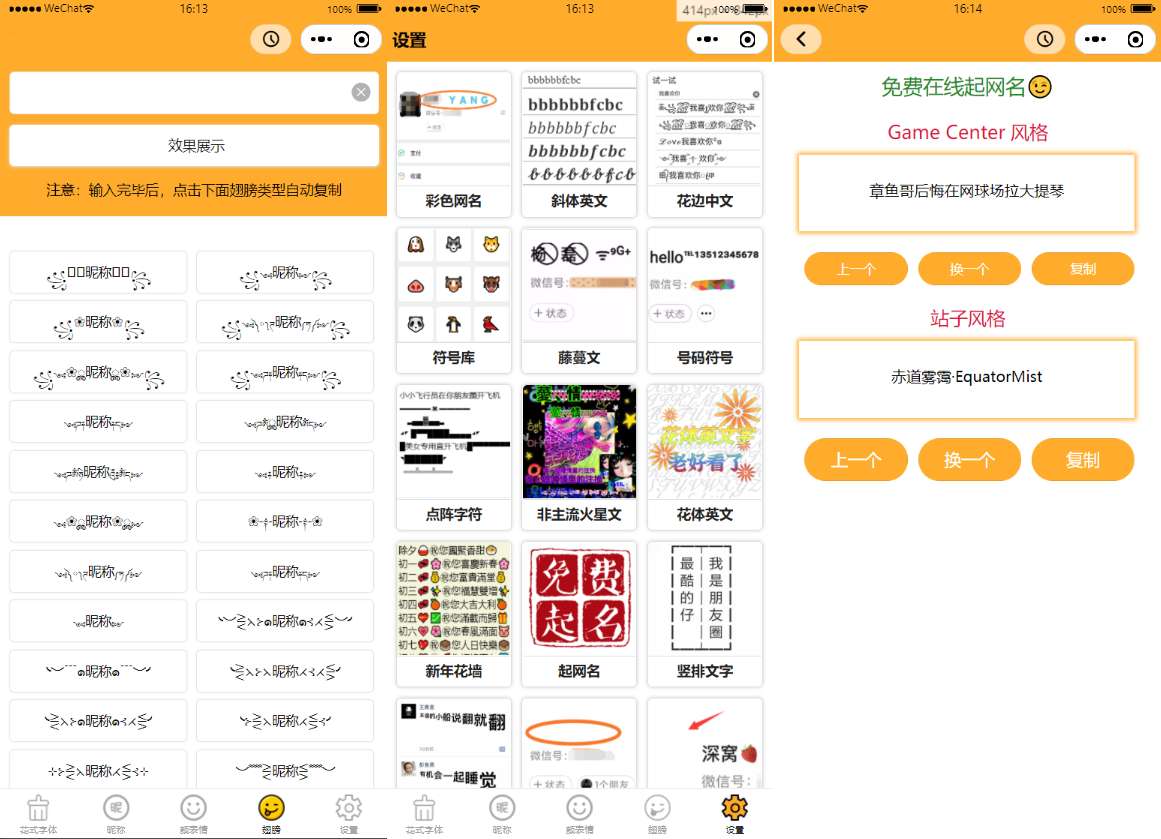 通过用户的自定义输入和选择,可以让用户生成各种字体,或者组合各种名字文案等等