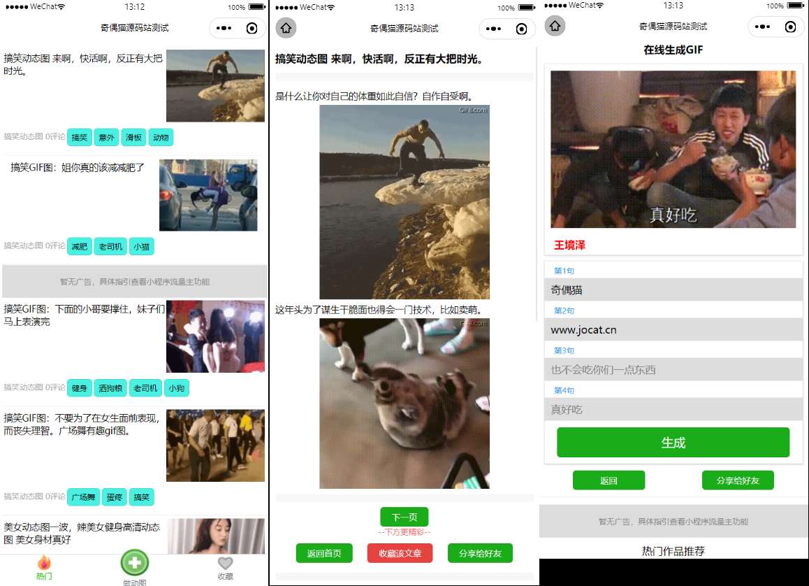 这是一款自动采集动态图内容的一款小程序 特点是每次刷新界面都会随机刷新动态图 每一个动态图都会带有对应的文案 总得来说小编也不知道说什么! 该小程序支持流量主功能 好了不多说了,大家自行研究吧!下面我们就来看看小编的测试演示图