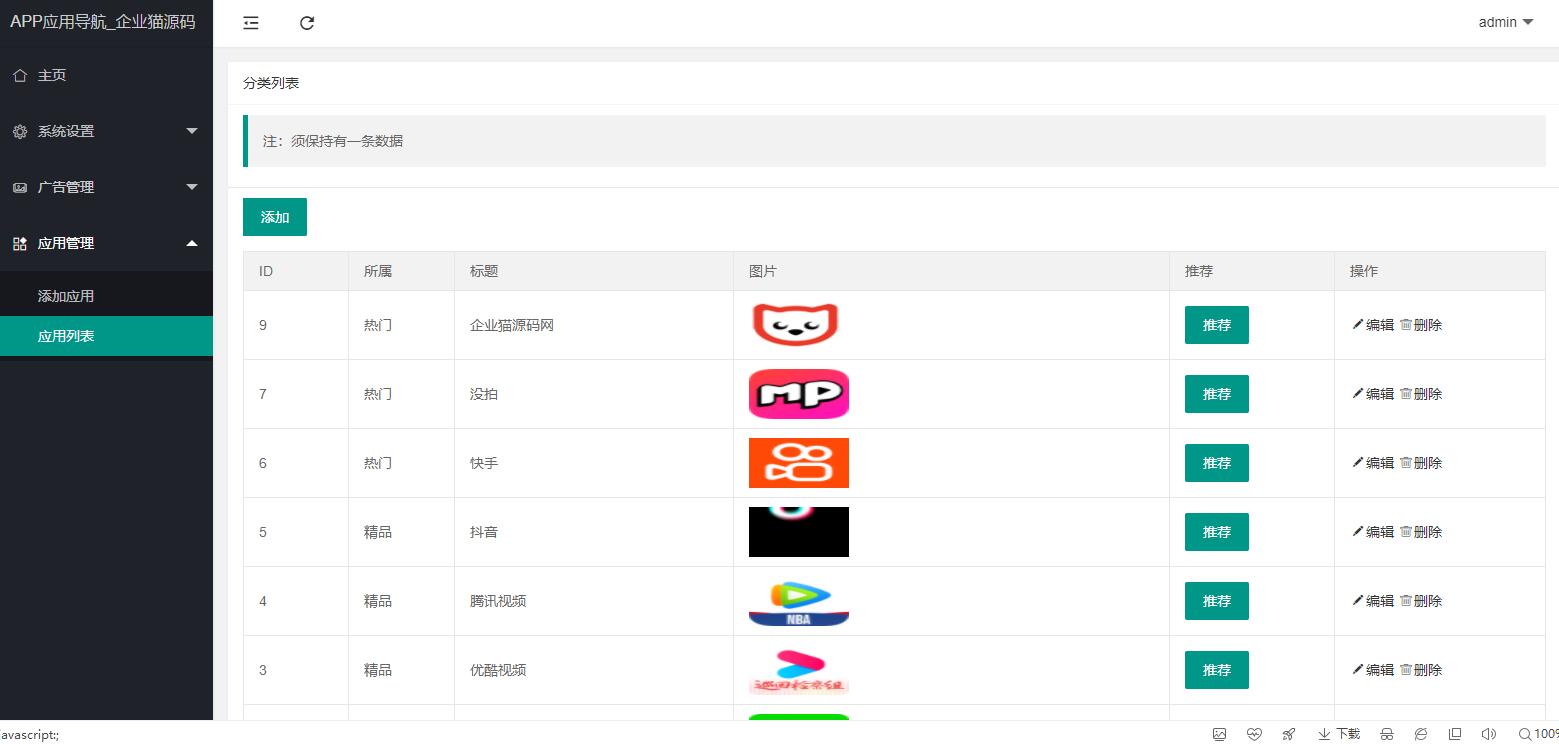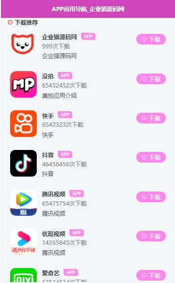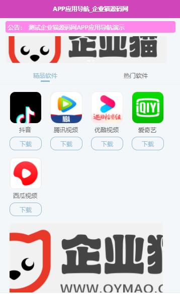 APP软件应用下载导航网站源码/APP分享下载页引流导航网站源码带后台版 这款源码 安装非常便捷干净,源码只有十几兆 只需要上传源码修改数据库连接信息即可使用。 后台添加应用及轮播广告也非常方便,小白看了都会!tp的后台响应也特别丝滑 测试环境:PHP7.0+MySQL5.6 企业猫源码论坛:www.qymao.cn