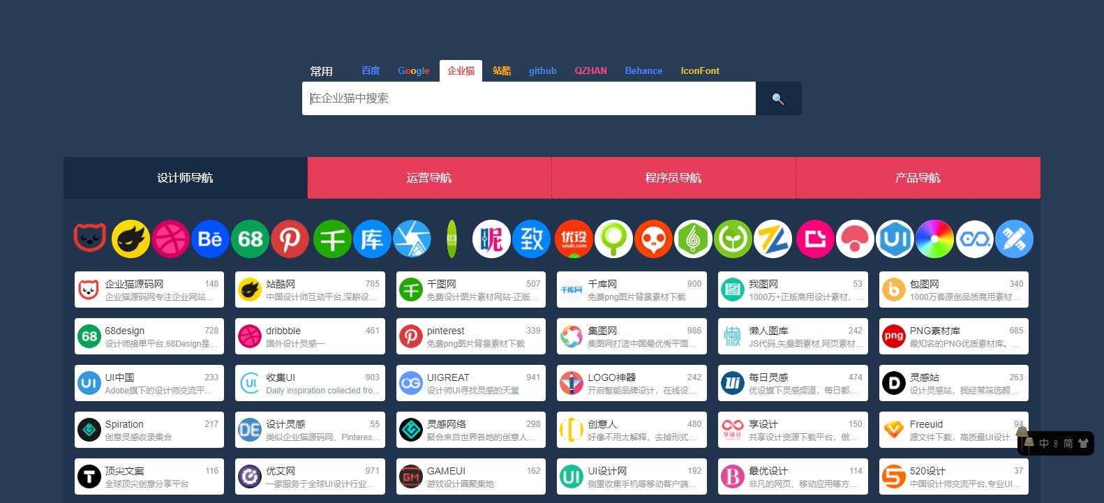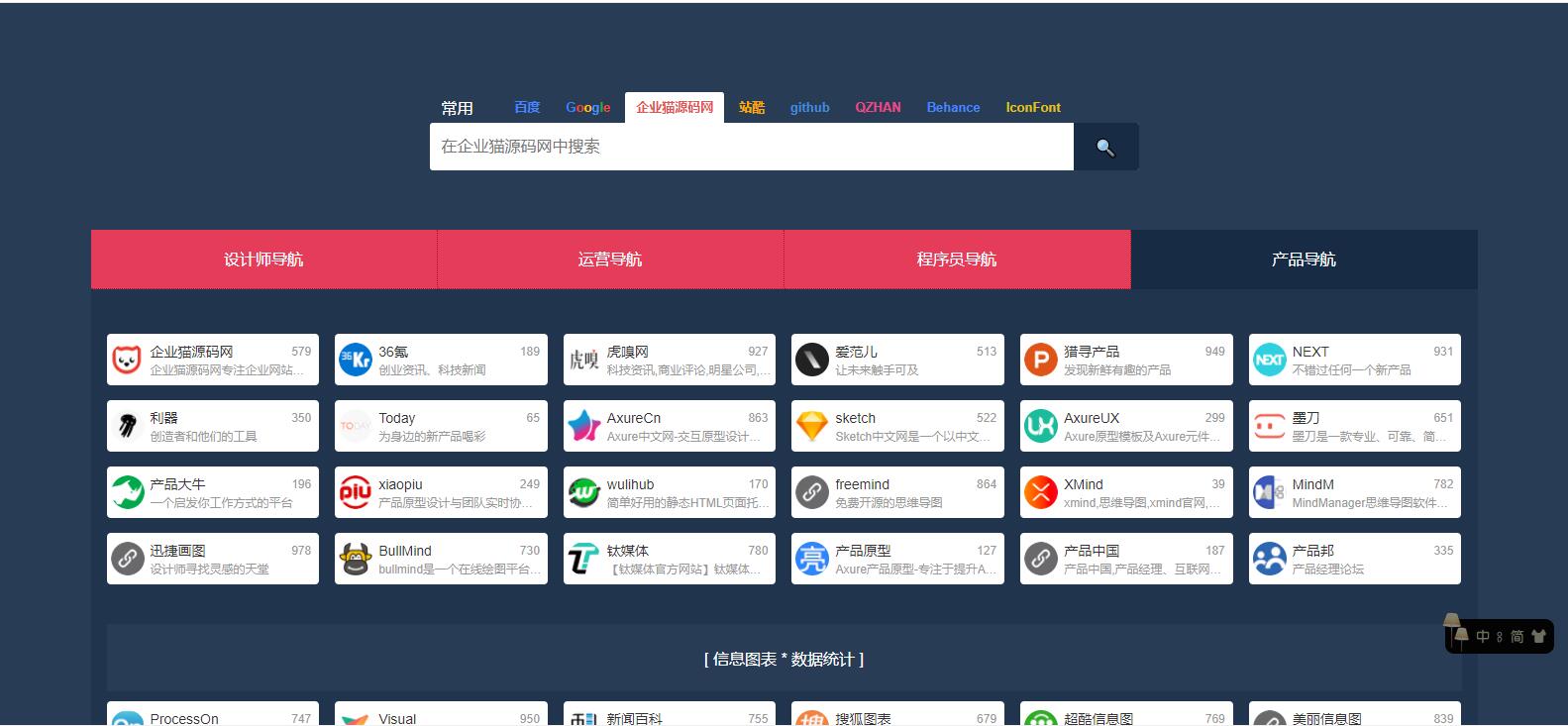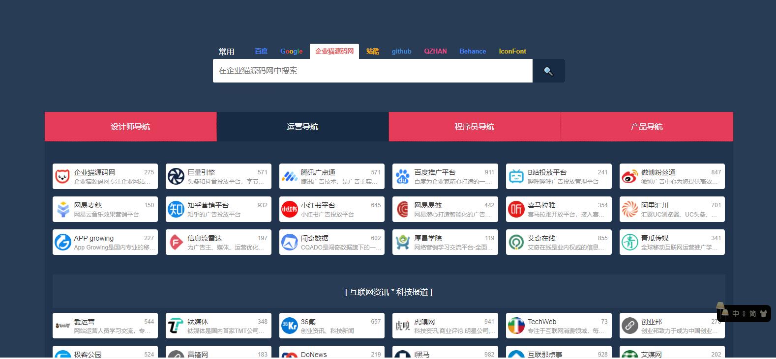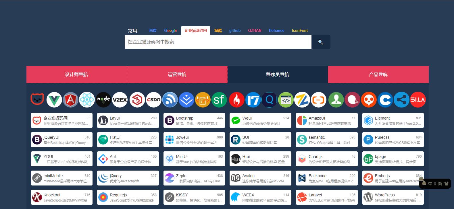 源码是扒996导航网静态页面,趴下来清理了里面杂乱广告与一些无关东西; 源码分为四个页面:设计师导航、运营导航、程序员导航、产品导航 站内导航内容已经充实,完善了基本工作中常用的设计 产品等网站,非常方便上班族的使用!