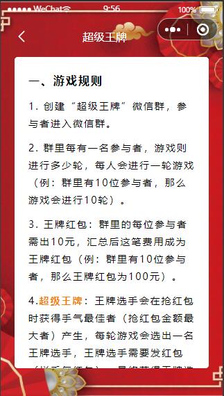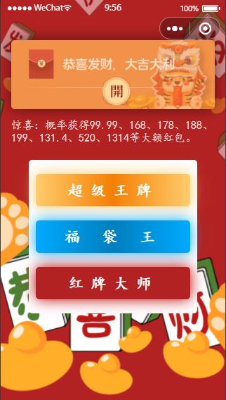 幸运红包娱乐微信小程序源码下载-多玩法安装简单 这是一个相当于一个幸运娱乐游戏微信小程序源码 内有多个玩法,比如超级王牌,福袋王,红牌大师 具体怎么玩小编就不在这多做介绍了 每一个游戏,进入界面后都有一个游戏规则介绍 所以大家看游戏规则就好啦