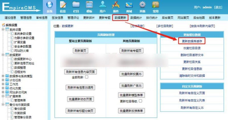 重新登陆后台后,首先执行“数据更新”--“更新数据库缓存”,在进行静态页面的刷新操作,以及网站一些基本信息的设置。如下: