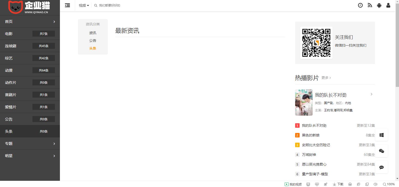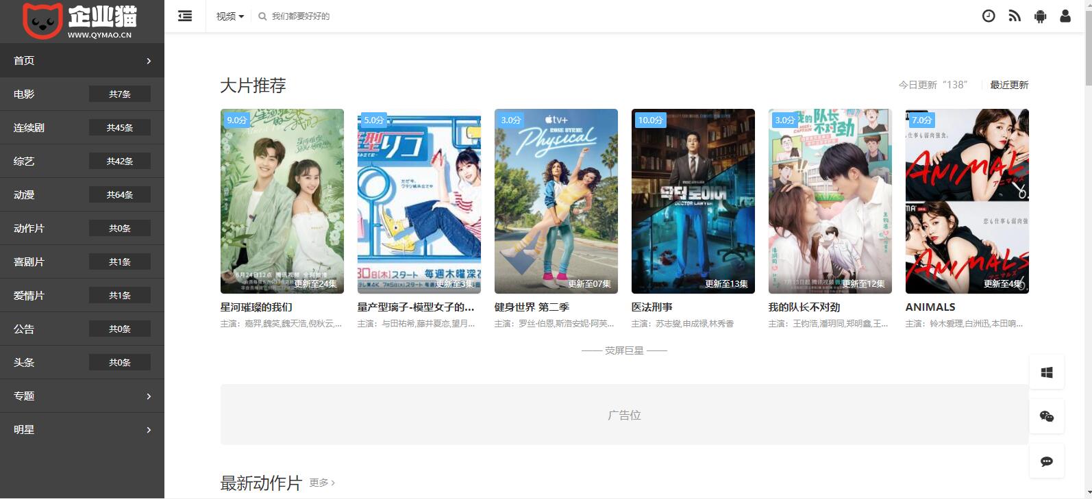 首涂24套左右布局苹果CMS自适应模板,带后台破解无授权,侧栏样式。 4个皮肤风格、自定义幻灯,包含了会员、专题、资讯、明星、评论、下载、剧情、留言页面等样式及全部功能。 此模板适用于苹果cms v10版本