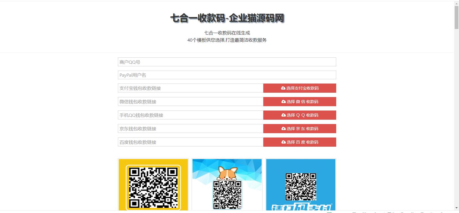 生成聚合收款码的系统,支持QQ商户、百度钱包、京东钱包、PayPal、QQ收款码、支付宝收款码、微信收款码, 样式模板挺多的,感兴趣的可以自行下载学习研究