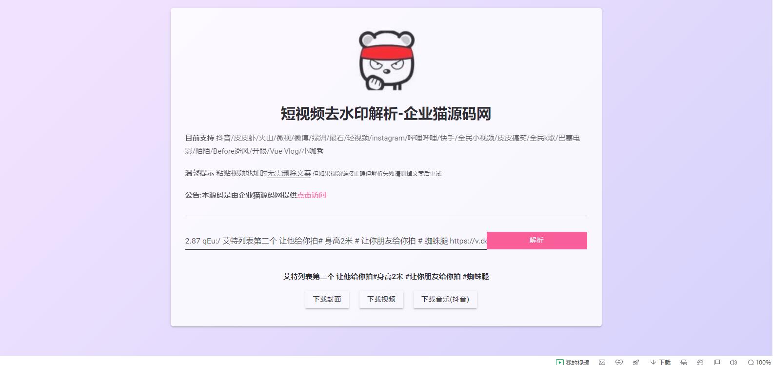 抖音/快手/b站/微视/西瓜/在线去水印附源码支持以下网站去水印 抖音 皮皮虾 火山 微视 微博 绿洲 最右 轻视频 instagram 哔哩哔哩 快手 全民小视频 皮皮搞笑 全民k歌 巴塞电影 陌陌 Before避风 开眼 Vue Vlog 小咖秀 西瓜视频 源码采用接口版,如果无法使用,自行修改接口、接口在129行 企业猫测试了下。打开速度较慢,但9-16号可以正常使用该源码去除抖音短视频水印,剩下的视频平台没有测试