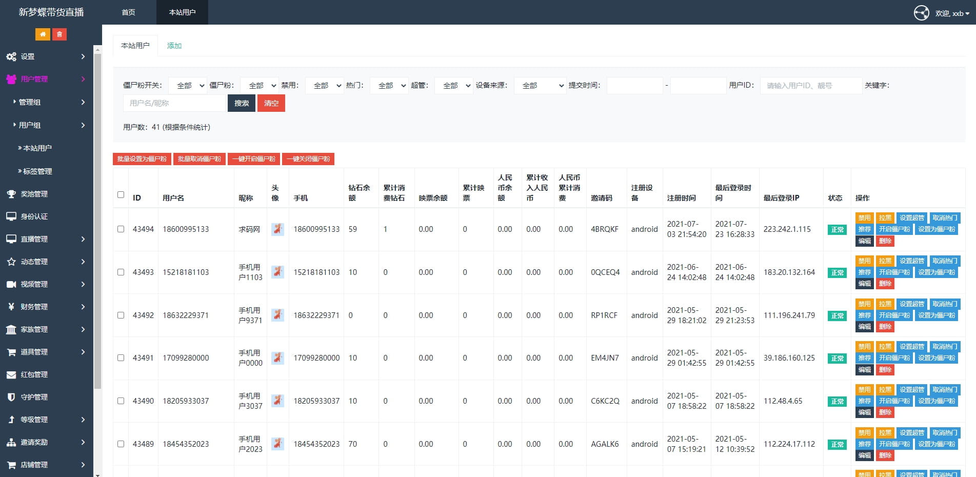 别人互换得来的,没有具体搭建研究,源码附带安卓跟苹果APP源码,没有教程跟安装文档,没技术得就别看了无售后, 需要自行研究,大概看了下好像是云豹二开得版本。 软件简介介绍: 直播带货APP系统源码 完全开源 后端 安卓 iOS 三端正常 邀请奖励 家族管理 直播带货 幸运礼物 直播计费 密码房间 全新直播商城系统源码 线上秀场直播 购物直播 直播带货 完美运营版本 直播连麦pk延迟低 完全开源源码可二次开发 短信接口:阿里云,容联云 直播接口:tx云,阿里云,七牛云,网宿,奥点云,网宿 版本为完美运营版本,系统流畅不卡,客户运营效果佳 优惠活动:赠送在线客服系统 赠送在线客服系统 赠送在线客服系统 2021直播系统基本简介如下: 1.物流配置,智能在线客服,幸运礼物,奖池全站通知 2.可设置强制邀请码选项 直播房间脏字敏感词过滤 3.APP引导页启动广告可设置图片或者视频模式,动态发布可发布语音 图片 视频 4.每日在线任务,直播间红包,直播连麦,直播pk,会员靓号坐骑 5.店铺可设置审核模式 免审核模式缴纳开店保证金等等,夜间模式,直播低延迟 6.APP首页推荐主播功能强大的美颜肥宅也能变男神,家族功能 家族分成比例 7.后台可控制私信开启或者关闭,家族控制,客服开关控制以及客服配置,直播间上下滑动切换,支持苹果ID,微信, QQ,手机,账号登录 定制扩展开发如下: 1.开发幸运礼物分销 2.开发了设置礼物分成,可设置用户刷多少礼物主播可获得多少收益 后端+iOS端+Android端直播源码,直播购物 直播商城 短视频商城 内购商城 自主添加商品 平台分销商品 第三方商品链接