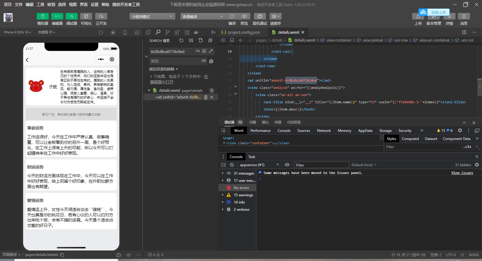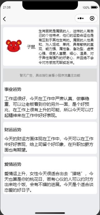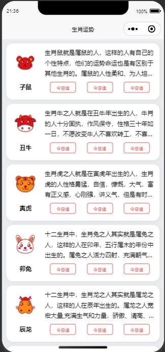 这是一个十二生肖运势查询的一个小程序源码 源码体制小,安装搭建简单 需要的自行下载研究吧 下面是企业猫的测试演示图!