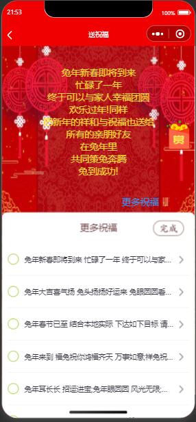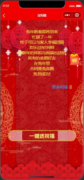 去年的时候小编也发过虎年的送祝福小程序 这不马上2023兔年了所以企业猫也给大家发兔年的送祝福小程序 早点发也好让大家早点抓住新春的流量福利 好了不多说,具体大家看企业猫的测试演示图吧!