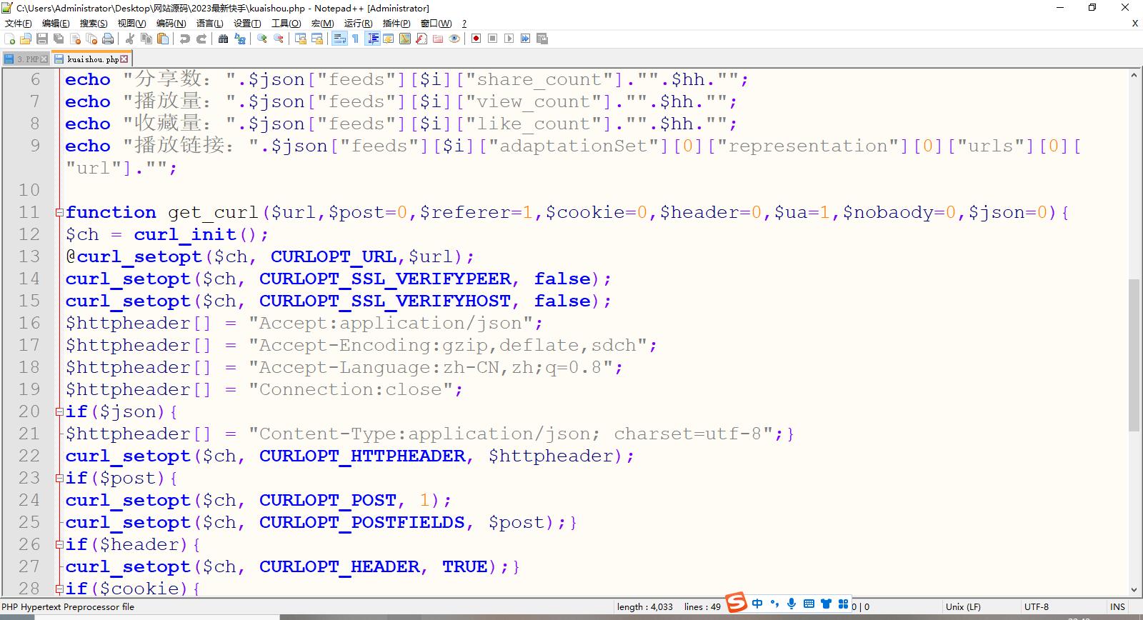 快手短视频去水印接口源码,快手又更新规则了,以前发的都失效了, 这个测试可用,最好单IP不要多次请求容易被快手拉黑, 支持输出:视频播放量,分享数,收藏量,无水印视频链接。 使用方法:你的域名/kuaishou.php?url=视频链接