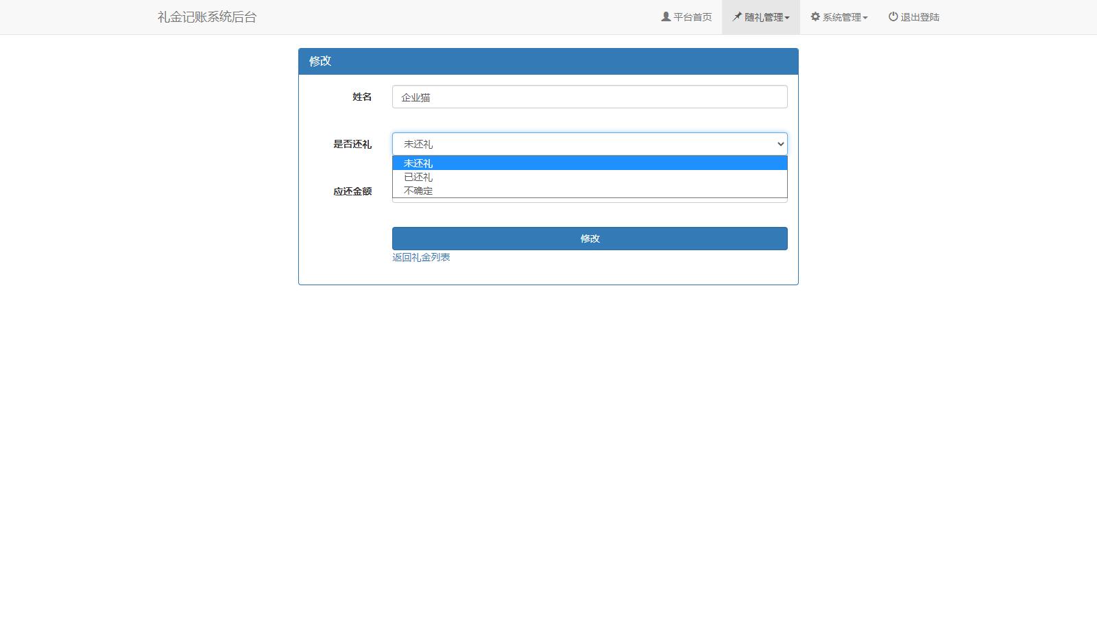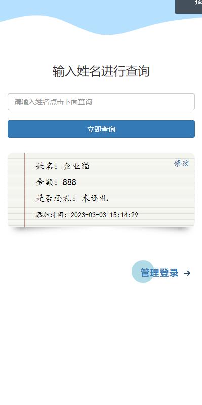 因为亲朋好友比较多在收份子钱之后还礼总是要打开微信查找转账记录, 如果隔的时间比较长还丢失,所以就简单该改了一下数据查询系统, 前台访问查询需要验证独立密码,后台支持新增记录, 修改记录,搜索记录,免费使用全开源无加密。