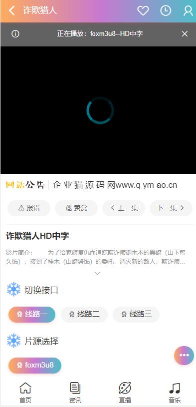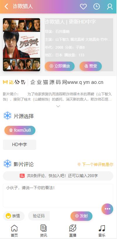 模板支持多色切换:樱桃-橘子-葡萄-青柠-炫彩-黑金 1.全站重写,风格延续MT 2.支持搜索记录,搜索联想,修改搜索为空时加载求片。 3.支持文章、视频收藏;支持文章、视频历史记录。 4.修改会员中心在顶部,未登录显示为图标,登录显示会员头像。 5.修改视频播放选集全为滑块,切换丝滑。 6.播放页增加分享按钮,一键复制短链分享。 7.增加影片评论,留言求片功能,增加表情选择,丰富评论,更为精彩。 8.首页loog自定义,可以选择文字或图片显示。 9.简单清新的跳转页面和网站关闭页面。 10.增加下载功能,增加播放下载付费功能。 11.增加全站更换皮肤功能,水果系皮肤随意更换。