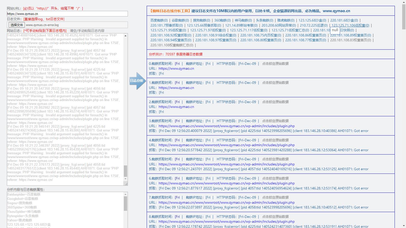 蜘蛛日志在线分析工具可用于快速分析网站访问日志中搜索引擎网络爬虫的抓取记录。