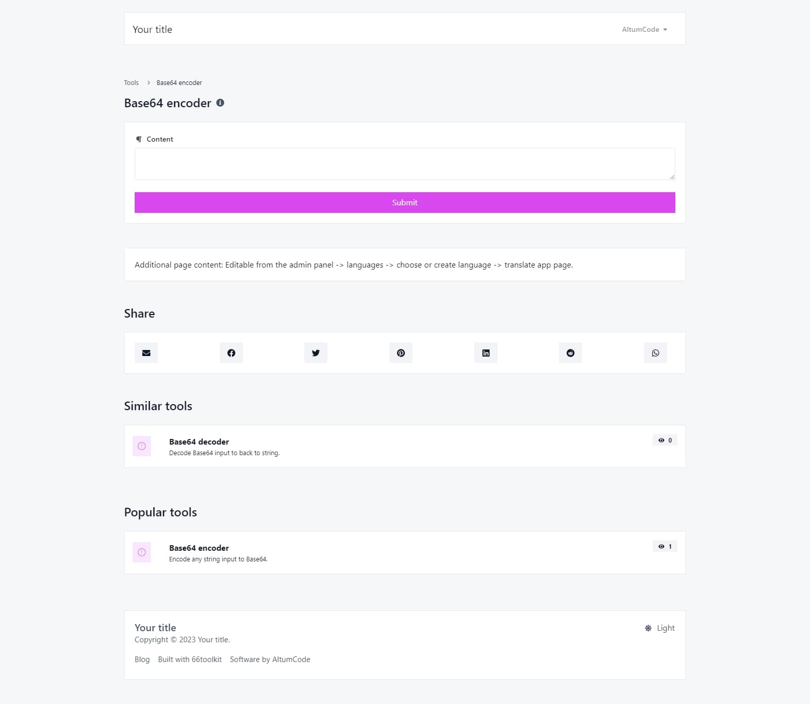 最新版全功能版PHP在线工具箱源码-66toolkit v16.0.0。是一个多功能的 Web 工具 PHP 脚本, 包含 45 种工具,适用于日常任务和开发人员。 功能简介 DNS 查找工具。 IP 查找工具。 SSL 查找工具。 Whois 查询工具。 平工具。 MD5 生成器工具。 Base64 转换工具。 Base64 图像转换工具。 URL 转换工具。 Lorem ipsum 生成器工具。 Markdown 到 HTML 工具。 等等