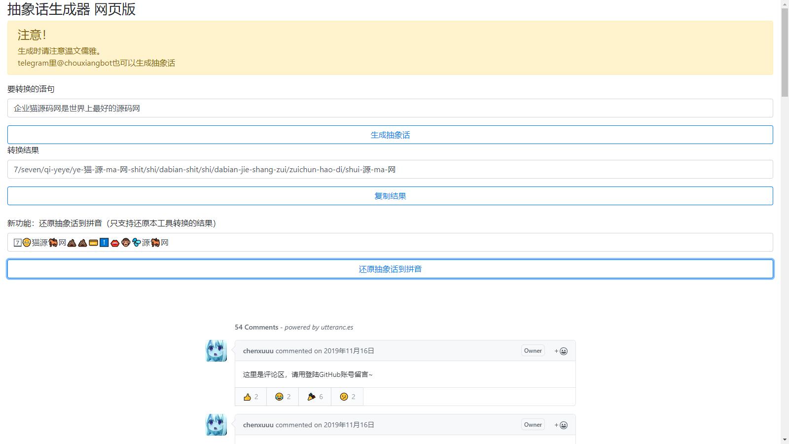 抽象话生成器网站源码,可以将普通语句转换成抽象化的表达方式,并且支持复制文本。 通过将抽象话转换成表情,可以给用户带来似懂非懂的效果,增加趣味性和神秘感。
