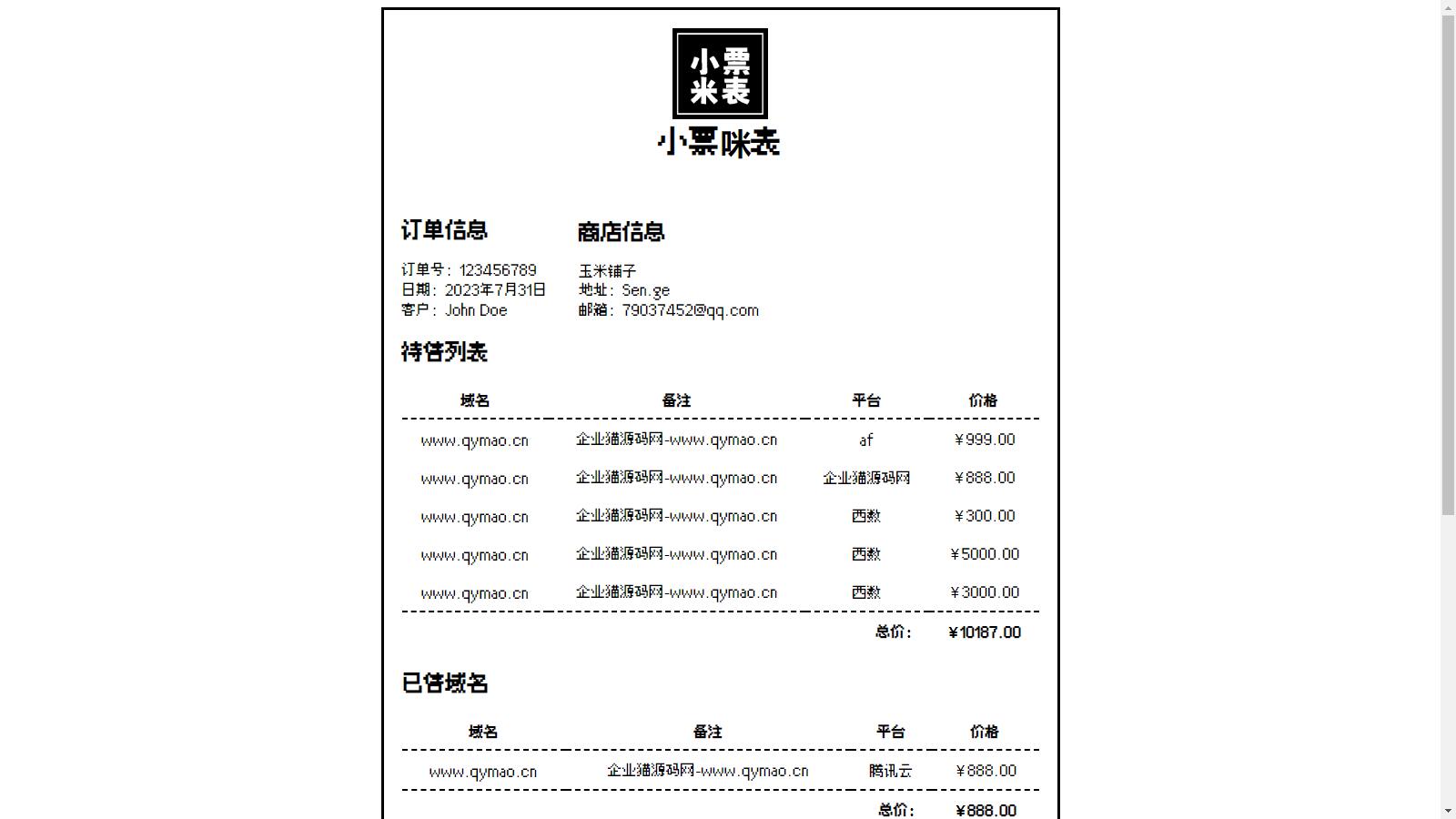 一种小票风格的米表单页,就像发票一样的域名出售页面,并附带后台搭建方法。