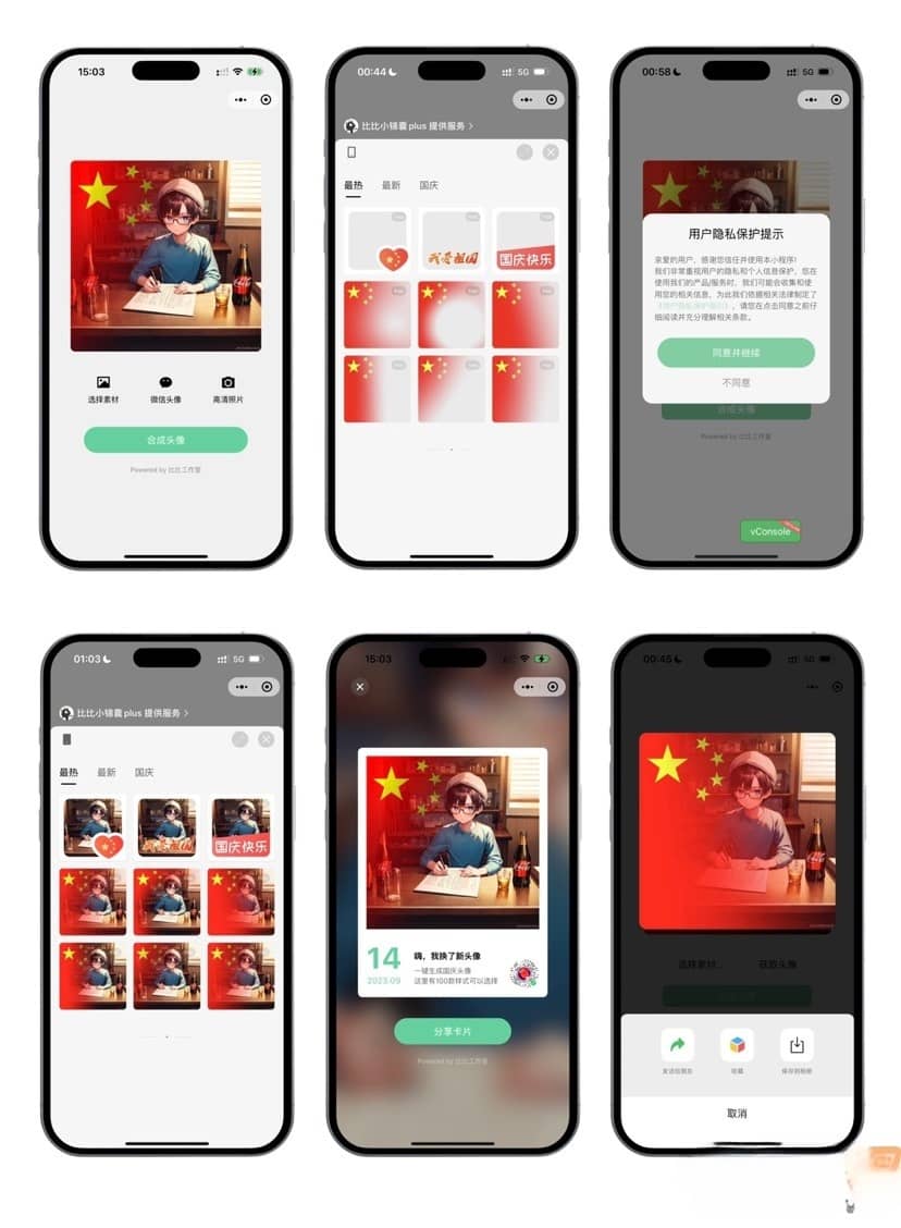 微信头像生成小程序,基于skyline+vue3+t该项目已适配微信小程序隐私政策,截图、获取头像等诸多新的接口 需要HBuilderX软件生成,不熟悉HBuilderX的可以看下以前发布过的小程序