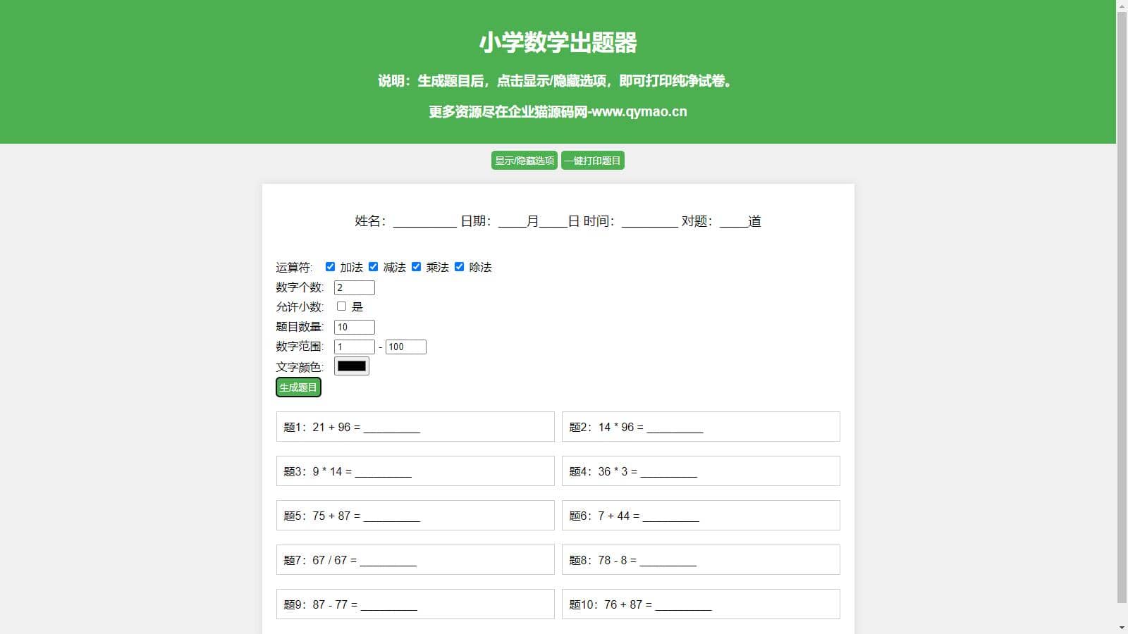 小学数学出题网页版源码,加减乘除混合运算,支持自定义数字、小数、混合运算, 支持加减乘除运算混合多选(一道题中同时随机出现加减乘除运算符)支持自定义出题数量, 支持一键打印成pdf,支持隐藏选项功能,打印纯净试卷,小学数学没有负数, 保证结果不出现负数,出题分列展示、新增答案下划线,支持小数运算 (不建议数字设置太大,毕竟小学生运算能力有限),支持姓名、日期、打分等。