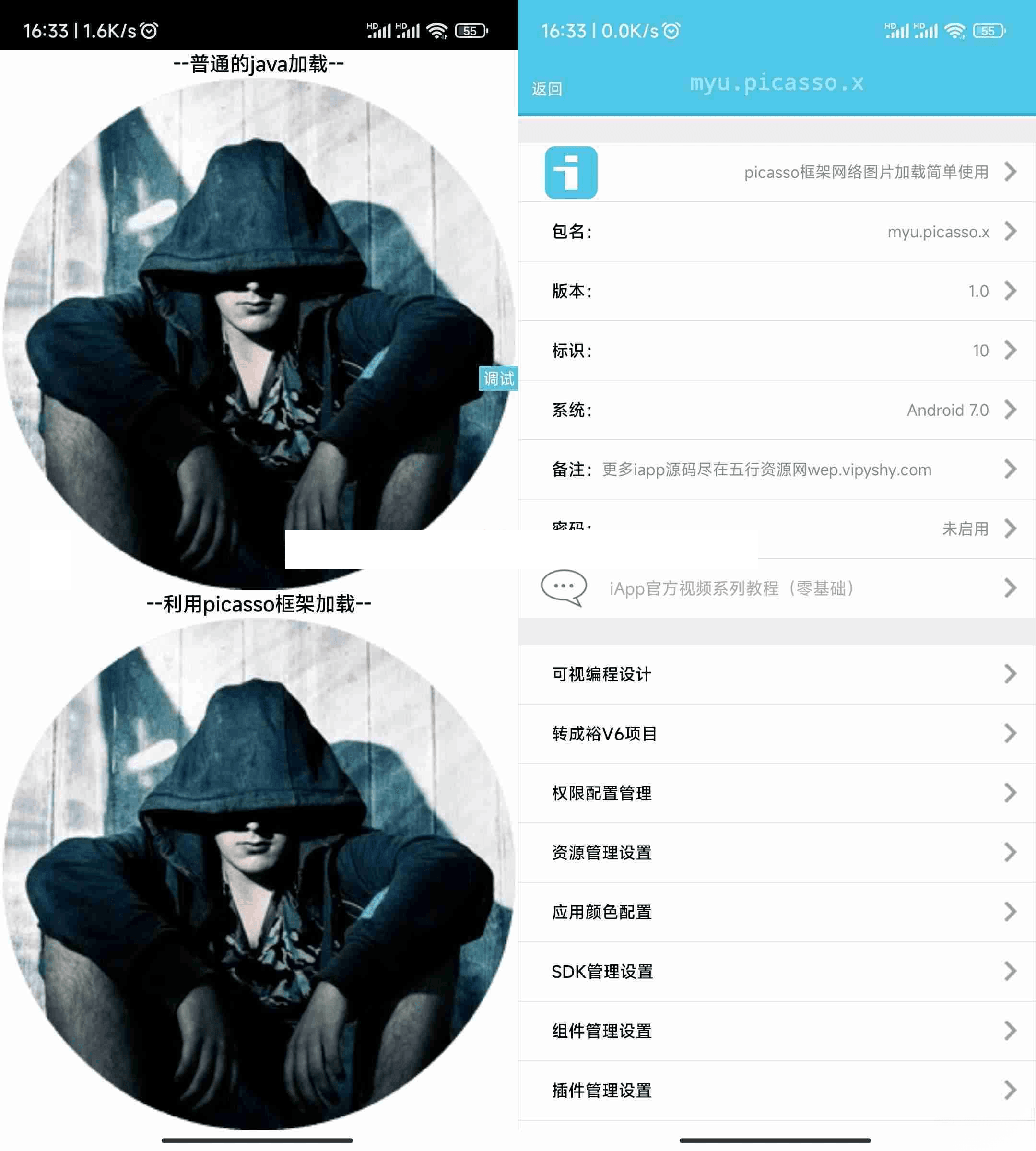 一款iapp加载图片的示例源码,演示中有分两种加载:普通的JAVA加载和利用picasso框架加载效果, 具体图片效果自己拿走测试吧,运用picasso框架,可以缓存,