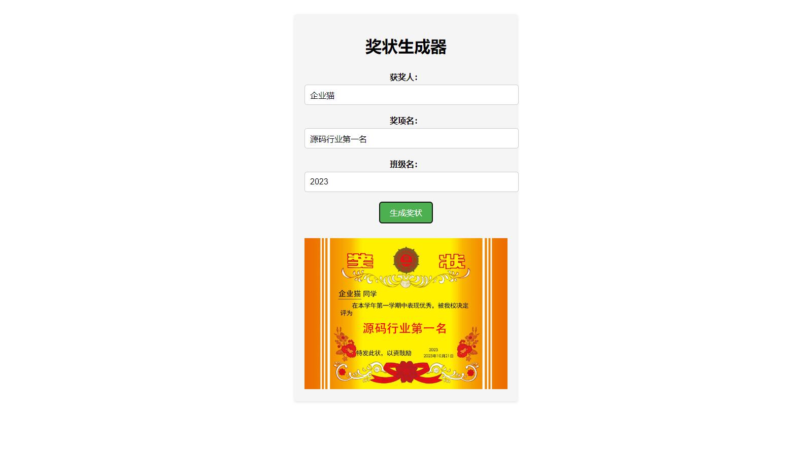 一个在线奖状生成器-Pear,是一个api接口版,替换相关参数然后复制链接地址到浏览器打开即可生成一张奖状, 可以获奖人姓名(不能超过3位字符)、奖项名(不能超过9位字符)和班级名, 感兴趣的同学可以试试。这边写了一个前端上传到服务器就可以用。
