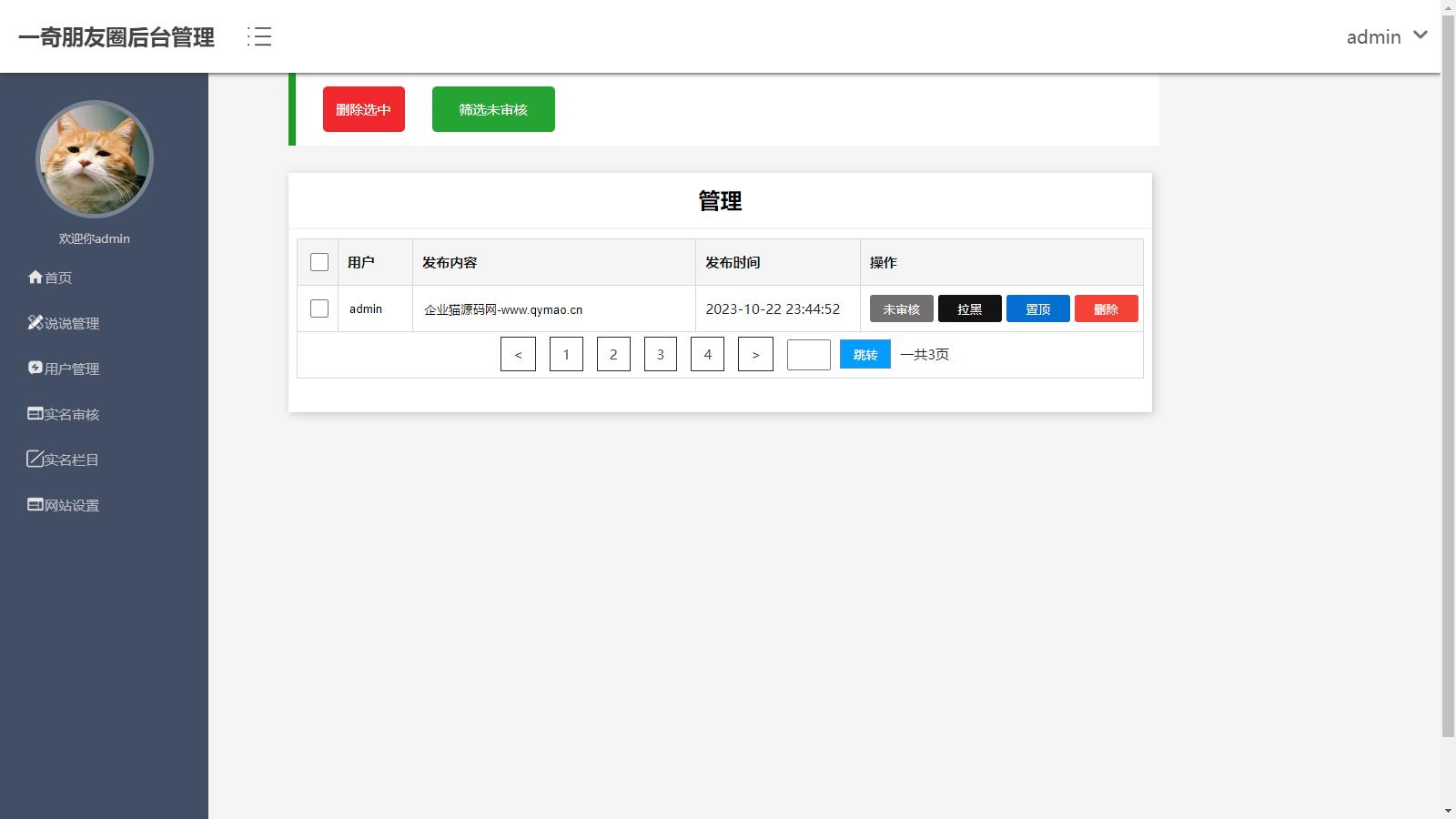 1.管理说说,可进行审核,拉黑用户,置顶,删除等功能。