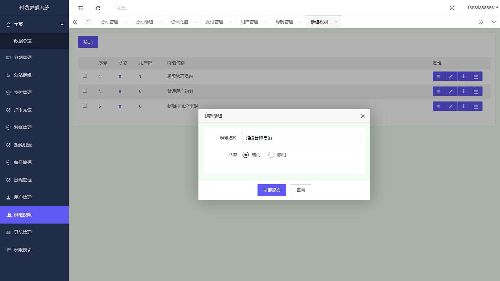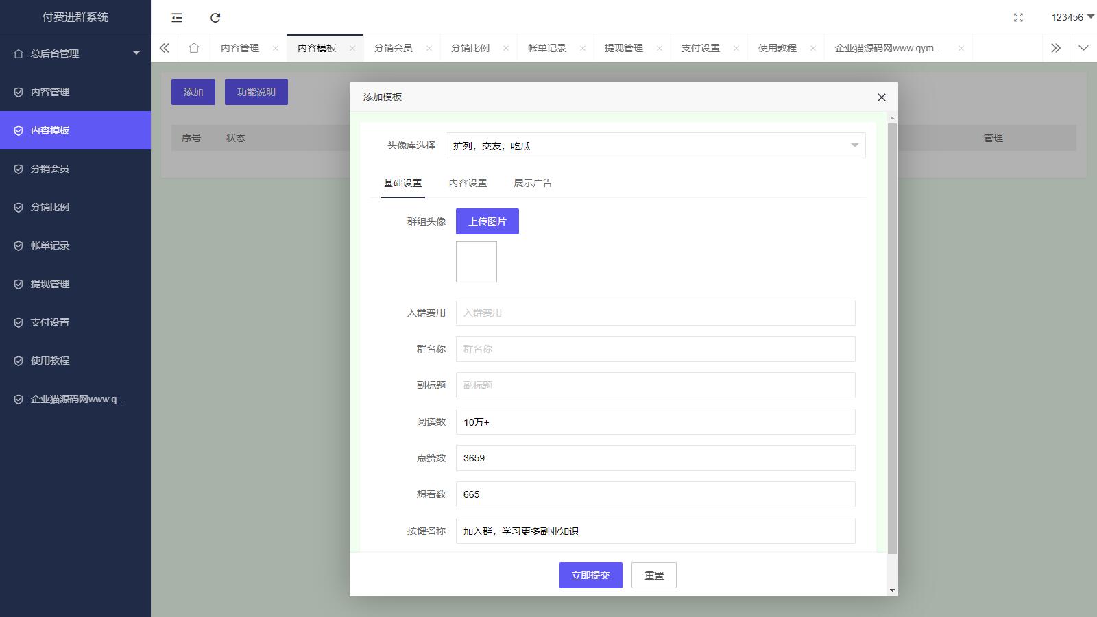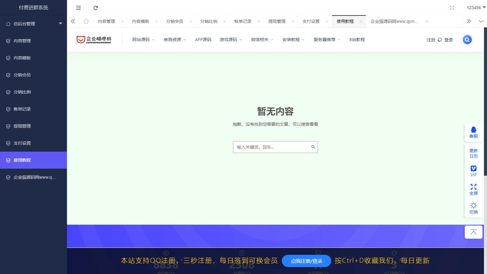 企业猫在11/3搭建了下,可以正常搭建出来,但一方面是后台比较多, 有总后台,分销后台,分站后台,太复杂了。另一方面,总后台的系统设置里的链接让别的站改成广告了。 我又把他的广告替换成自己的广告了。企业猫对于这源码不太熟悉就没继续研究, 也不清楚在那搞出来群界面。感兴趣的自己搭建看看吧。