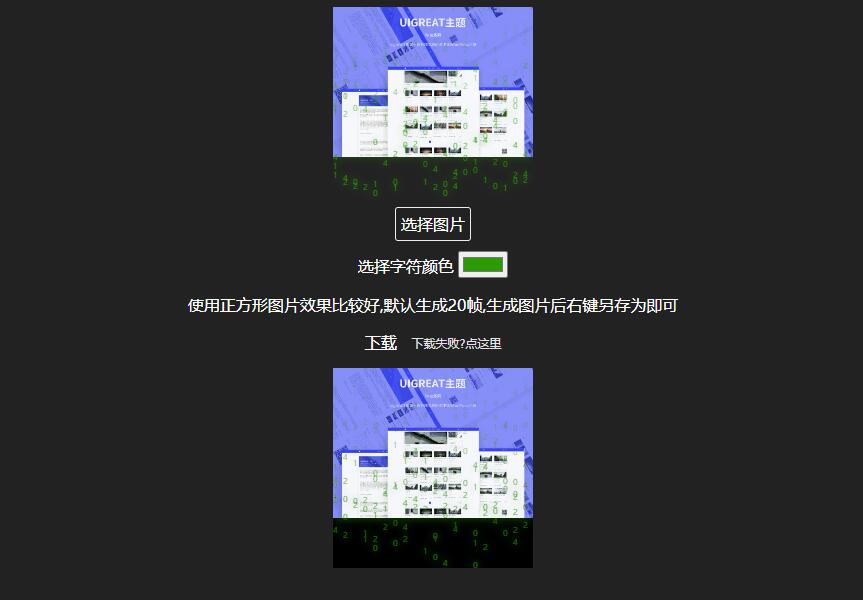 定制个性头像:生成数字雨动图的演示Demo 这个演示Demo允许您上传头像并生成数字雨动态图。您可以自由改变字符颜色, 并选择自己喜欢的颜色。使用正方形图片效果最佳。 默认生成20帧的动图,生成后只需右键另存为即可保存。