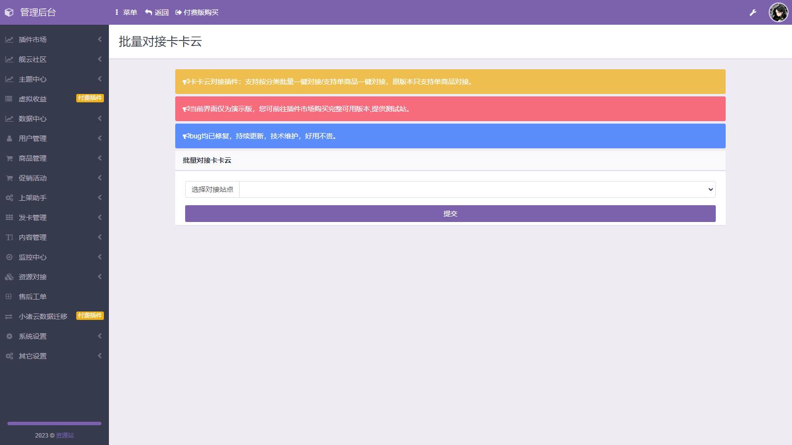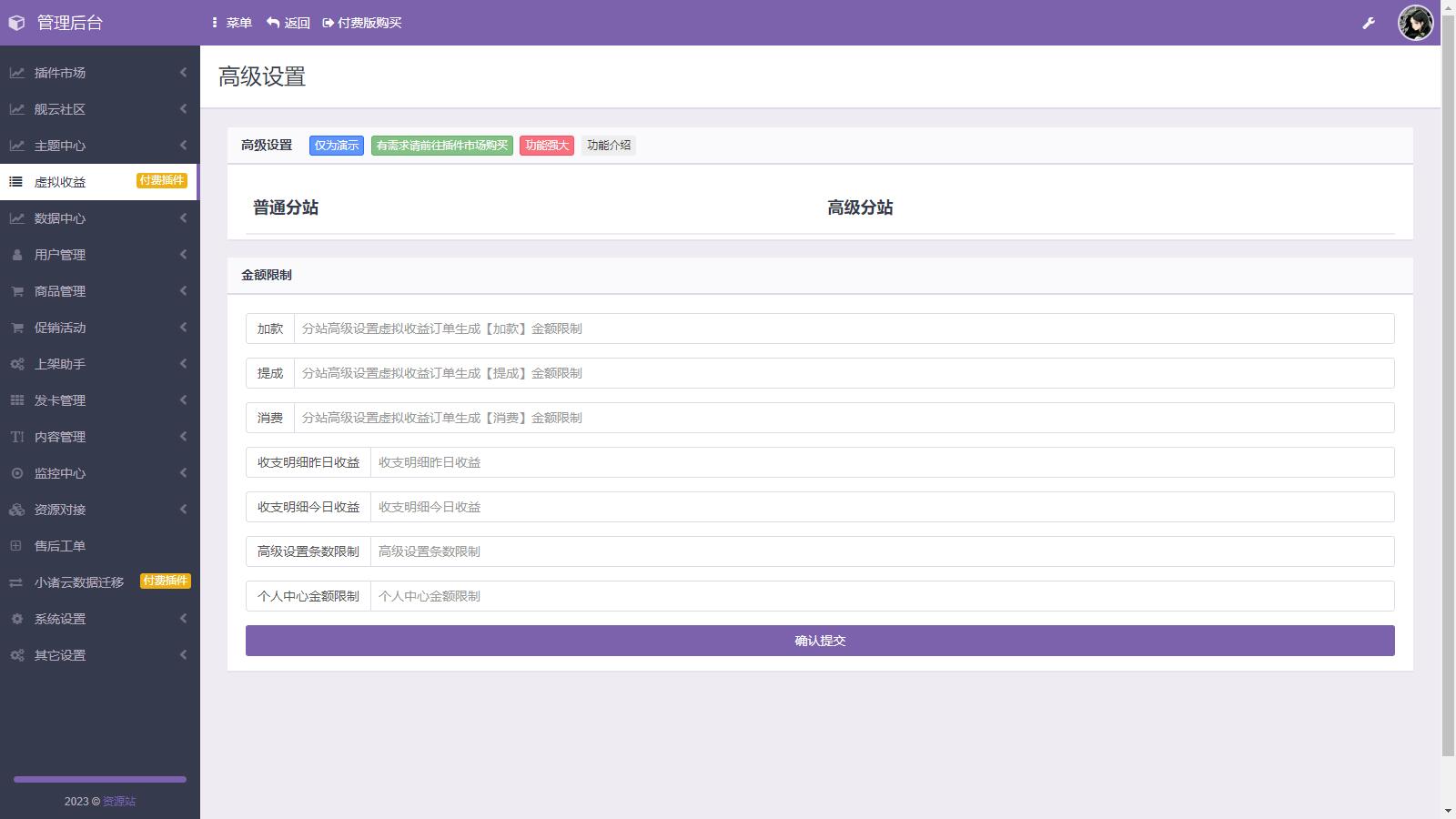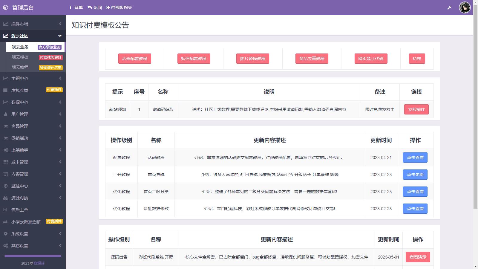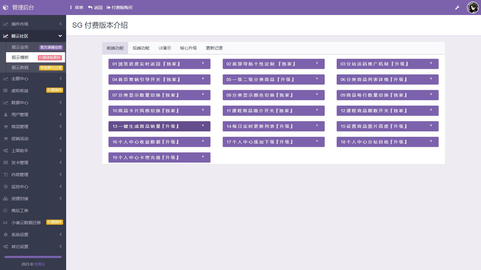 新增 插件市场 舰云生态系统全面打通 支持一键在线安装更新插件 支持自定义下级插件购买售价 支持自定义插件市场上级信息,微信 :QQ: 业务网址: 新增 团购优惠插件 新增 商品秒杀插件 新增 商品砍价插件 修复 团购无法弹出成团提示问题 修复 团购成功后无法成功发货问题 补充 多项缺少的函数 /is/ajax 文件 恢复 商品详情淘宝样式的购买下单模块优化 在线更新引导更新提示更新之后需要手动导入 install/update.sgl,否则会报错 企业猫看了下,有加密文件,后台功能变得更多了,而且还有插件市场, 不过里面的插件可能需要付费。