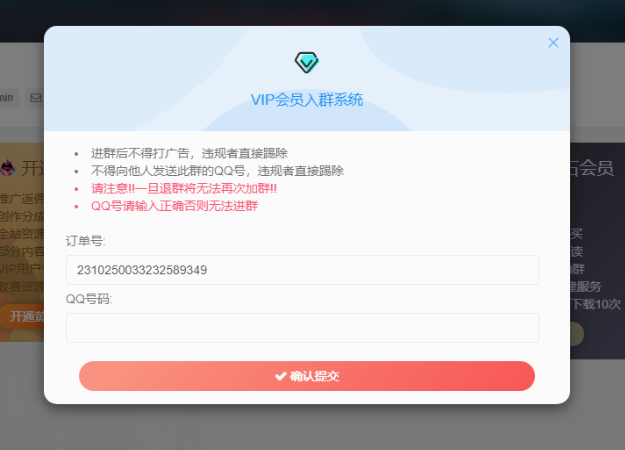 源码介绍: WordPress子比主题 添加VIP会员入群验证弹窗插件 源码截图: 声明:本站所有文章,如无特殊说明或标注,均为本站原创发布。任何个人或组织,在未征得本站同意时,禁止复制、盗用、采集、发布本站内容到任何网站、书籍等各类媒体平台。如若本站内容侵犯了原著者的合法权益,可联系我们进行处理。