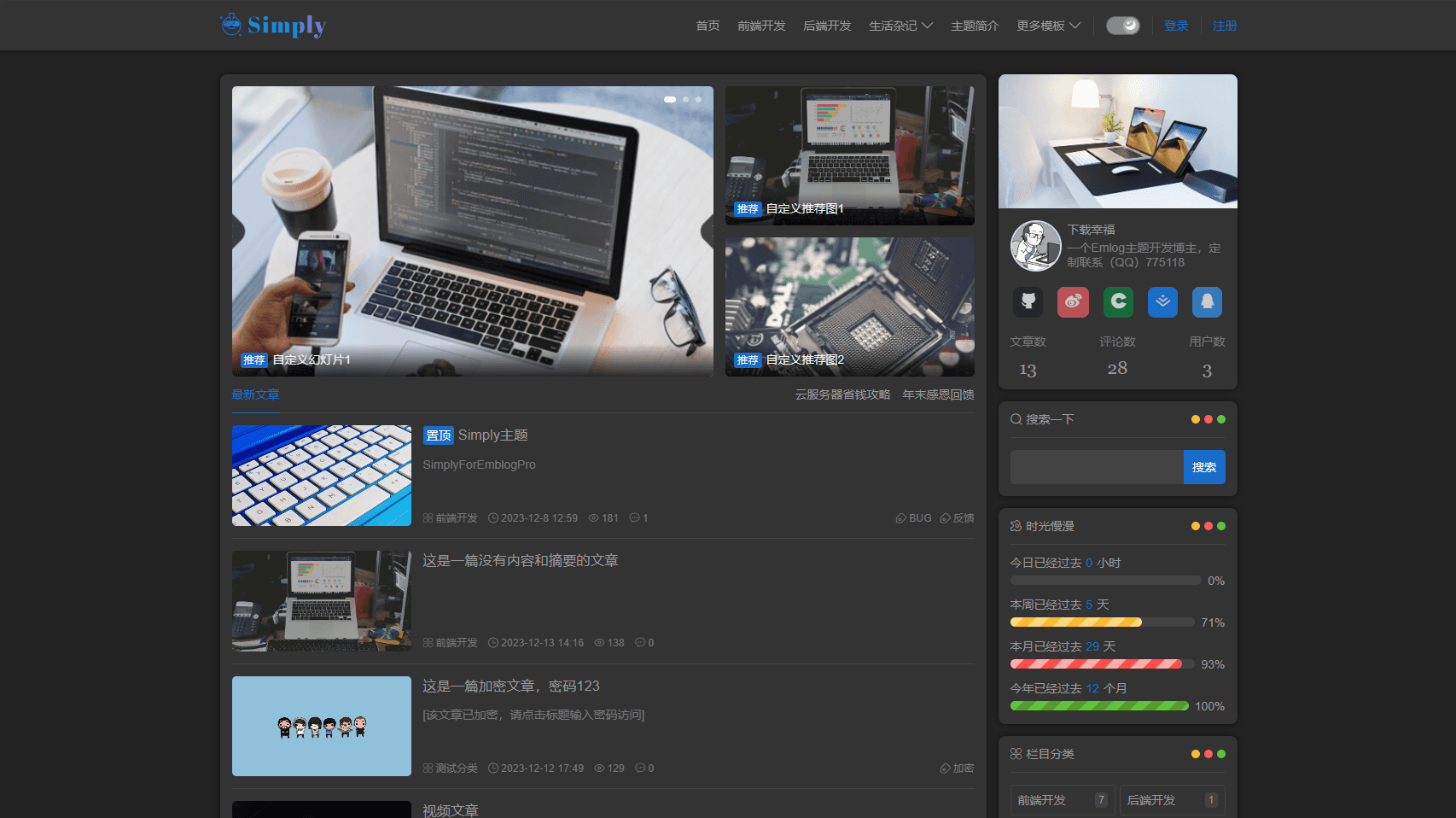 Simply是一款简约风格的Emlog博客模板,响应式布局、界面简单大方,实用性强! 支持夜间模式,采用localStorage存储配置。IOS系统下支持随系统自动切换浅/深色模式。 文章页支持显示文章字数及阅读时间。 支持http/https 响应式主题,支持PC、平板、手机端浏览 丰富的主题模板设置项,可在后台模板配置中设置轮播图、广告、博主背景图、博主链接、用户等级等信息