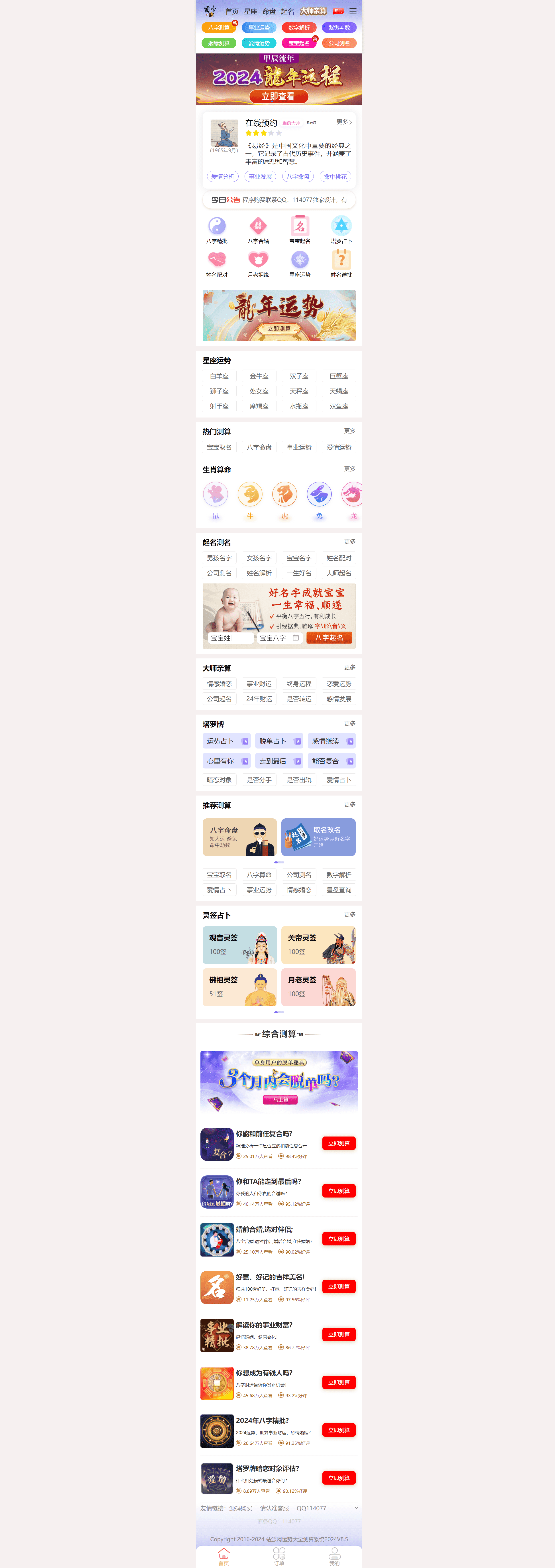 企业猫从几个网站都下载了一遍,发现都缺少数据库文件,这应该是别人放出来的引流版, 直接免费放出来了。感兴趣的自己下载看看吧 1、修复时间不能选择子时; 2、部分机型支付后不跳转; 3、新增后台支持按照时间、项目、进行订单筛选查询; 4、数据库新增测算结果的纳音、藏干、感情、性格分析; 5、微信支付支持 https 证书; 6、修复 PC 端扫码支付问题; 7、新增代理分销功能; 8、新增会员功能,会员分月会员,年会员,终身会员; 9、新增会员免支付功能; 10、清除大量外调接口、提高打开速度、安全有保障。 11、修改价格和支付接口均在后台完成。 12,修复八字合婚结果无数据问题! 13,账号 admin 密码 114077
