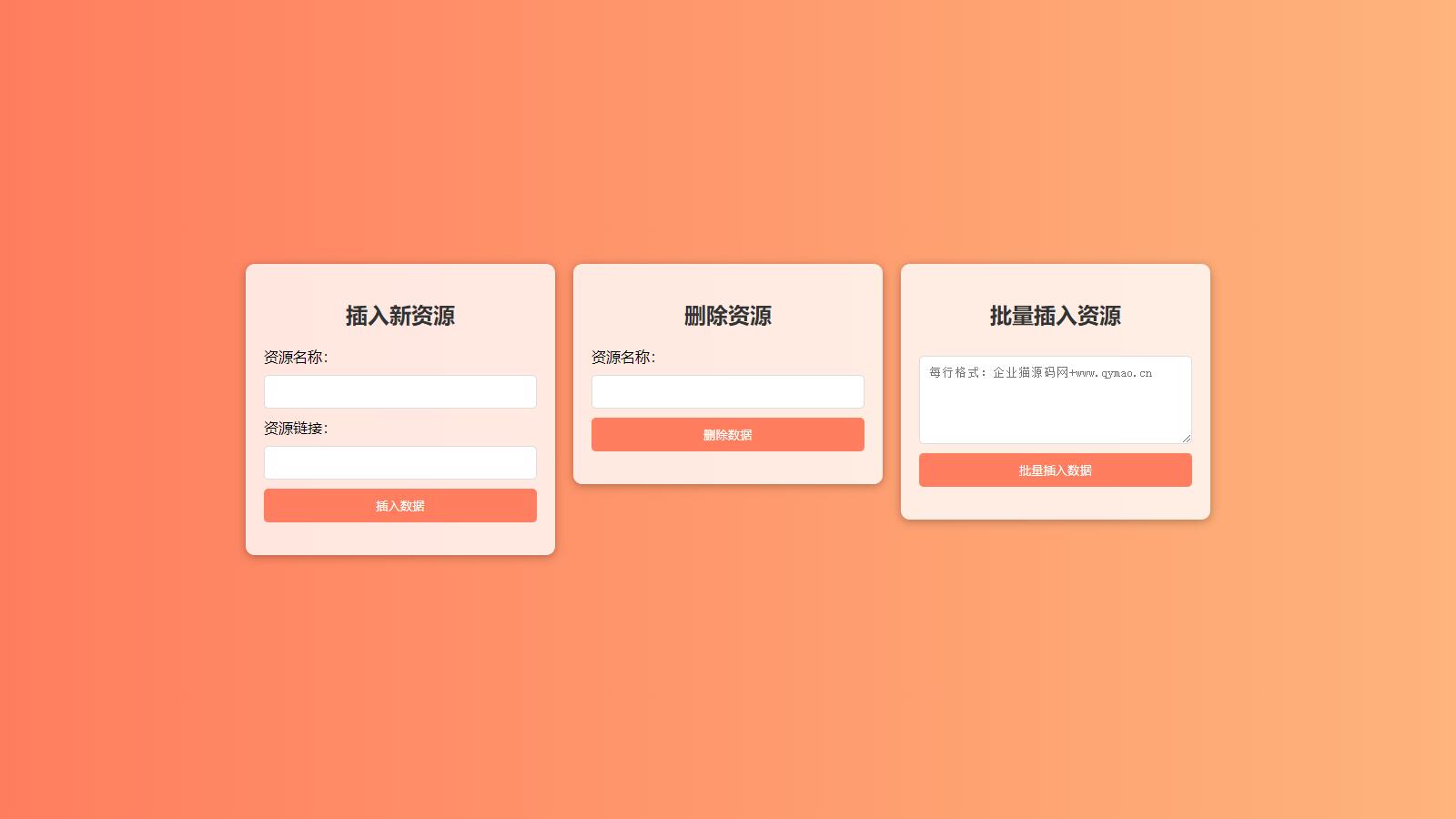 环境:PHP 7.3 Mysql 5.6 1. 上传源码到网站目录中 2. 修改【admin.php】中, $username =‘后台登录账号’; $password =‘后台登录账号密码’; 后台登录地址 http:// 你的域名 /admin.php 3. 导入数据库 database.sql 4. 修改【config.php】中数据库配置信息 $DB_HOST =‘localhost’; $DB_USER =‘数据库用户名’; $DB_PASSWORD =‘数据库密码’; $DB_NAME =‘数据库名’;