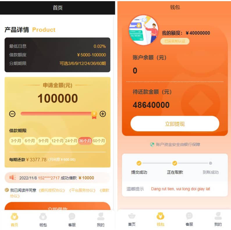 后台 代理 前端均为vue源码,前端有中文和越南语 前端ui黄色大气,逻辑操作简单,注册可对接国际短信,可不对接 用户注册进去填写资料,后台审批,审批状态可自定义修改文字显示