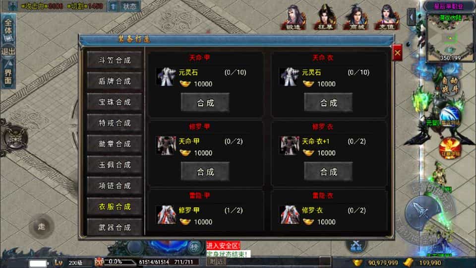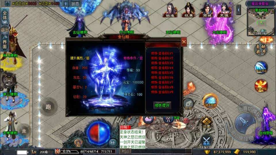 1:星辰变修仙系统 2:初级境界:先天期、金丹期、元婴期、洞虚期、空冥期(晋升需”筑基丹”) 3:高级境界:渡劫期、大成期、天仙期、金仙期、玄仙期(晋升需”神灵石”) 4:超级境界:神人、神王、天神、天帝、天尊(晋升需”元灵石”) 5:地图分布:第一大陆,进入条件(先天期、金丹期、元婴期、洞虚期、空冥期)晋升5级,共8个图 6:地图分布:第二大陆,进入条件(先天期、金丹期、元婴期、洞虚期、空冥期)晋升5级,共8个图 7:地图分布:第三大陆,进入条件(先天期、金丹期、元婴期、洞虚期、空冥期)晋升9级,共8个图 8:地图分布:第四大陆,进入条件(渡劫期、大成期、天仙期、金仙期、玄仙期)晋升9级,共8个图 9:地图分布:第五大陆,进入条件(神人、神王、天神、天帝、天尊)晋升9级,共8个图 10:初级装备:炎炽 破空 幻凝 穿云 残雪(回收”元宝”) 11:高级装备:赤血 神羽 万魔 破天 幻影(回收”筑基丹”)(回收”神灵石”) 12:超级装备:天命 修罗 雷隐 赤霞 龙皇(回收”神灵石”)(回收”元灵石”) 13:怪物:第1大陆、10个BOSS/地图、爆(天命装备) 14:怪物:第2大陆、8个BOSS/地图、爆(天命、修罗装备) 15:怪物:第3大陆、8个BOSS/地图、爆(天命、修罗、雷隐装备) 16:怪物:第4大陆、8个BOSS/地图、爆(天命、修罗、雷隐、赤霞装备) 17:怪物:第5大陆、8个BOSS/地图、爆(天命、修罗、雷隐、赤霞、龙皇装备) 18:技能介绍:先天剑法,圣之术,天神术,天火剑术,一剑开天,倚天辟地,擒龙手 19:技能触发:致命一击,每10次攻击触发一次( 双倍攻击2秒) 20:技能触发:倚天辟地),每30秒攻击触发一次( 双倍攻击5秒) 21:切割系统,战士吸血(时装/魂环)系统 22:剑仙傀儡澜风:需要提升境界后、用元灵石提升、最高九级金仙 23:商场系统:4货币商场/可以卖经验卷,常用道具物品(根据需要添加) 24:特效说明:切割雪飘,野蛮特效,背包比较箭头,自动穿装(戒指手镯除外) 25:多功能背包:仓库,摆摊,回收,邮件,动态背包 26:雪飘系统:独立的雪飘,暴击特效,切割雪飘 27:怪物百分比血条,BOSS超大血条 28:添加手动拾取按钮,点击后可以拾取物品 29:动态公告:增加动态公告宣传片